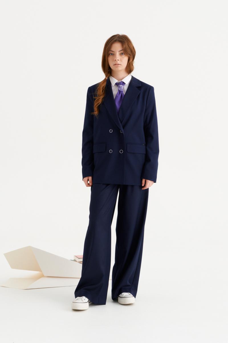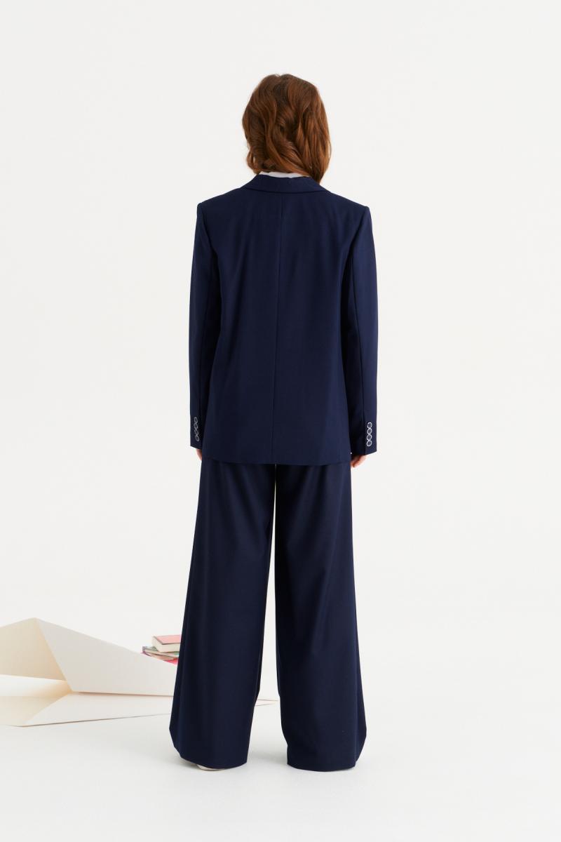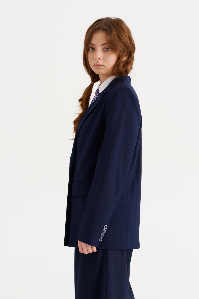 Жакет для девочки полуприлегающего силуэта с центральной застежкой на три петли и пуговицы, с V-образным вырезом горловины, с втачными рукавами.