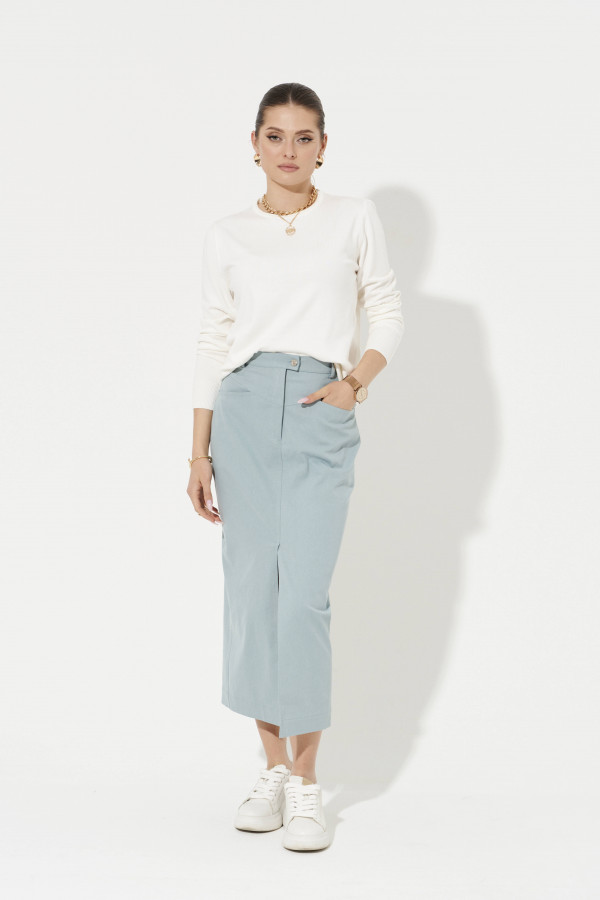 Блузка полуприлегающего силуэта, с центральной застежкой на петли и пуговицы и одну петлю и пуговицу на воротнике.