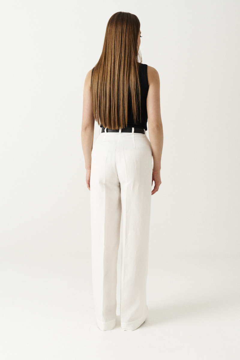 Брюки женские прямые из смесовой ткани с добавлением льна для повседневной носки. Верхний срез брюк обработан притачным поясом, застежка на один крючок, а также имеется застежка на тесьму-молнию в среднем шве брюк. Пояс брюк имеет шлевки, что дает возможность носить с ремнем. Задняя часть брюк имеет талиевые вытачки. В брюках расположен в боковом шве карман с подкройным бочком. Отличный классический вариант брюк в красивом бежевом оттенке, который станет базовой вещью в вашем гардеробе.