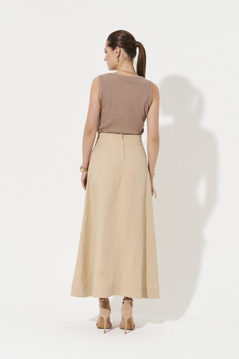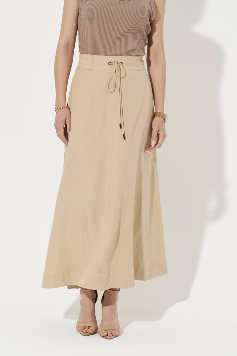 Юбка женская из смесовой ткани для повседневной носки. Юбка, расширенная к низу. Верхний срез юбки обработан притачным поясом со вставкой на резинке в боковой части пояса. В поясе имеются шнурки для регулирования облегания. Переднее полотнище юбки со средним швом. Заднее полотнище со средним швом и небольшой застежкой-молнией в шве. В боковом шве имеются потайные карманы. Длина юбки миди. Красивая и удобная юбка бежевого оттенка обязательно осчастливит вас своим внешним видом, а немаловажным плюсом является лен в составе материала. За счет своей интересной конструкции она обязательно будет стильно смотреться на вас.
