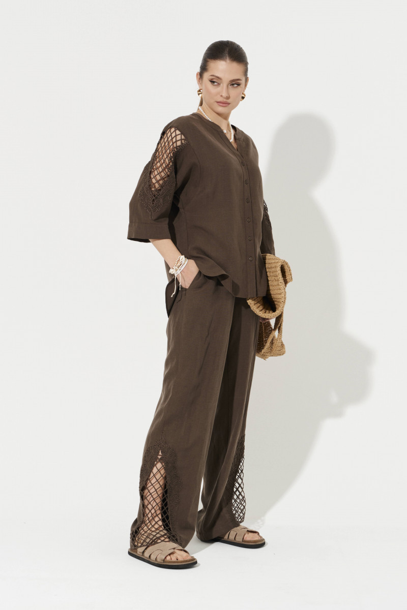 | 44 | Брюки: Высота посадки - 27,5см, Длина брюк без пояса - 107,5см, Длина по внутреннему шву - 84,5см, Ширина брючин сверху - 67,5см, Обхват брюк по низу - 55см, Ширина по бедрам - 52см, Ширина по талии - 33см; |