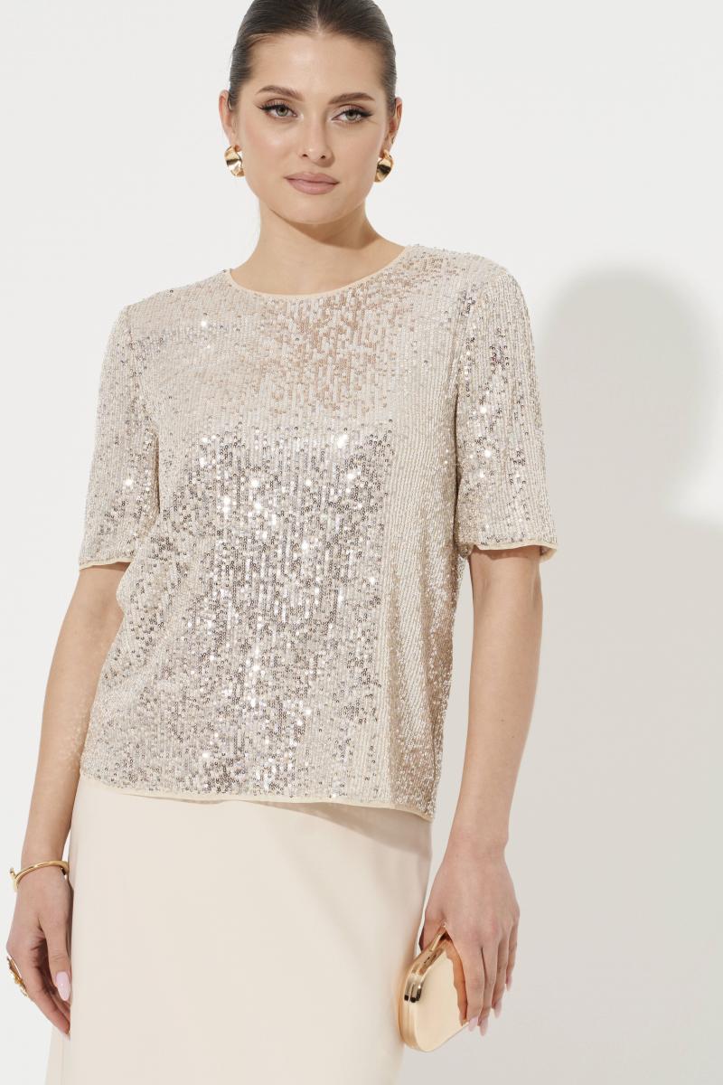 Женская блузка из вискозной ткани прямого силуэта предназначена для повседневной носки. Модель украшена пайетками, что придает ей изящный и праздничный вид. Спинка с средним швом и застежкой-молнией в шве обеспечивают удобство при надевании и хорошую посадку. Низ изделия обработан окантовочной сеткой, которая повторяет отделку горловины и рукавов, а также придает блузке завершенный и стильный вид. Втачные рукава чуть ниже локтя с обработкой окантовочной сеткой создают аккуратный и элегантный образ. Блузка на вискозной подкладке отлично сидит на любой фигуре, подчеркивая женственность и стильность. Эта красивая и элегантная модель станет отличным дополнением к вашему гардеробу для особых случаев или повседневных образов.