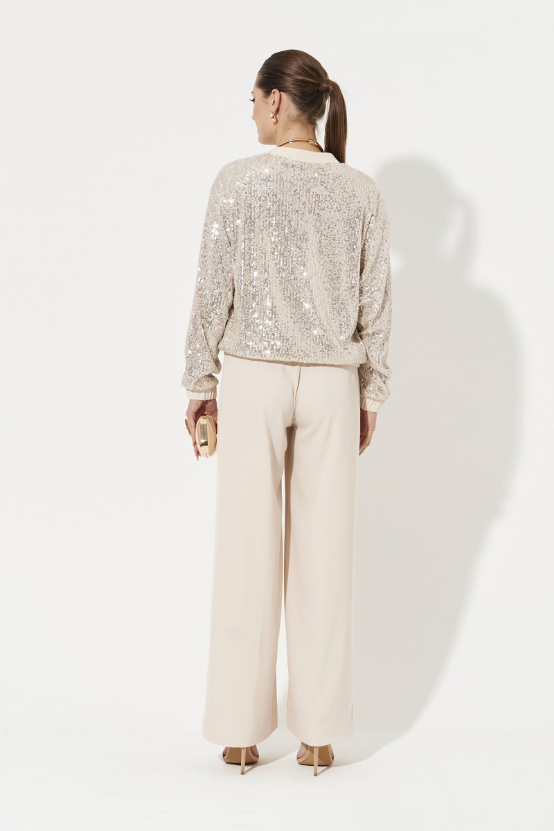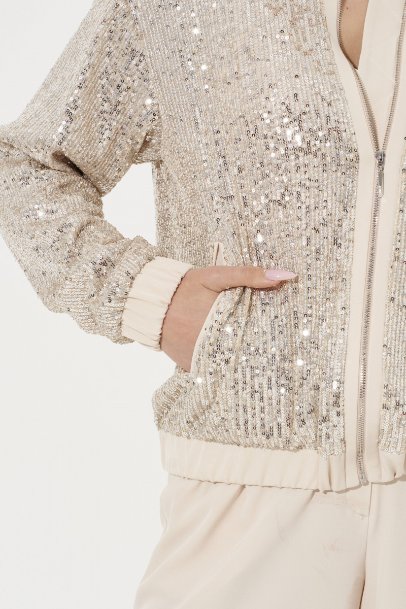 Жакет женский из нарядной ткани в пайетки. Жакет с длинным втачным рукавом. По низу рукава манжета на резинке. По переду имеются прорезные карманы в рамку. Горловина обработана стойкой. Застежка на молнию, вдоль которой отделочные планки. По низу жакета притачной пояс с резинкой. Планки вдоль молнии, манжеты, пояс по низу изделия оформлены деталями из атласной ткани. Жакет на вискозной подкладке. В этом нарядном жакете вы будете неотразимы!