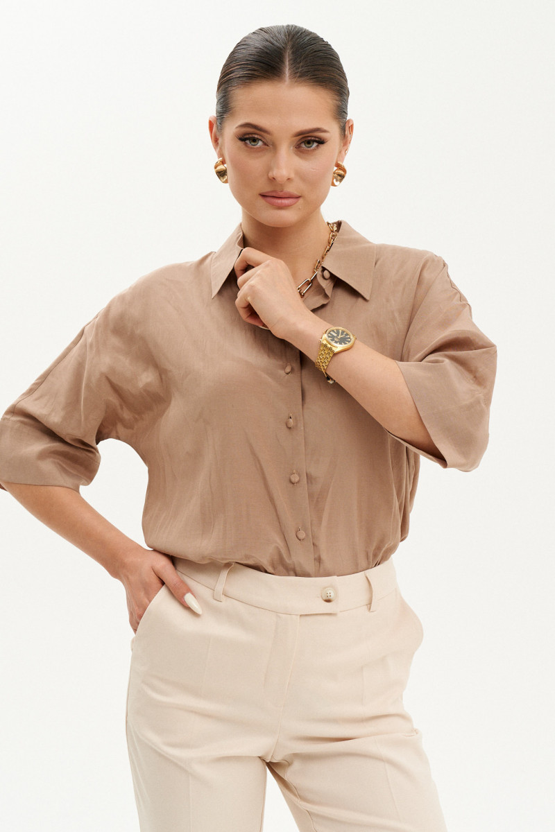 Блузка женская из смесовой ткани с большим содержанием хлопка для повседневной носки. Застежка центральная бортовая на обметанные петли и пуговицы. В боковых швах имеются небольшие разрезы. Горловина обработана рубашечным воротником с отрезной стойкой. Рукава цельнокроеные, длина чуть ниже локтя, низ рукава обработан притачной манжетой. Красивая и легкая блузка в бежевом цвете станет не заменимой вещью в вашем гардеробе.