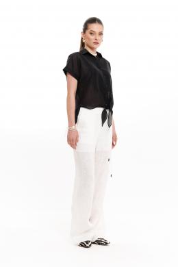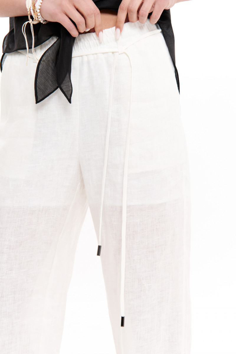 Брюки женские из льняной ткани для повседневной носки. Брюки прямые. Верхний срез брюк обработан притачным поясом со вставкой на резинке. Брюки имеют шлёвки, что дает возможность носить их под пояс, а также имеются маленькие шлевки под завязки. В боковом шве имеются карманы с подкройным бочком. Брюки на хлопчатобумажной подкладке в виде шортиков. Стильные брюки белого оттенка, в которых вы обязательно будете смотреться модно. Данные брюки будут очень удобные в носке. В данных брюках вы будете выглядеть элегантно и притягивать восхищенные взгляды прохожих