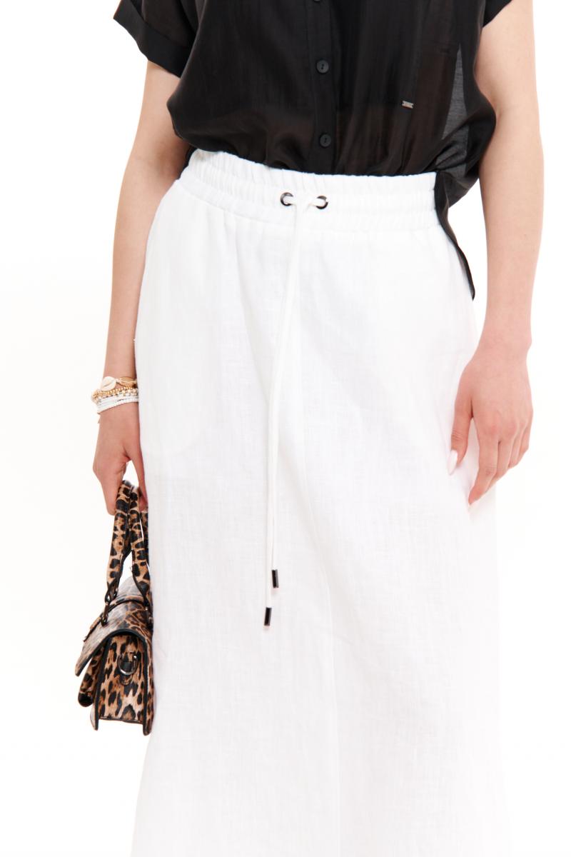 Юбка женская из хлопчатобумажной ткани для повседневной носки. Верхний срез юбки обработан притачным пояса со вставкой на резинке и вставленными завязками. Переднее полотнище юбки со средним швом. Заднее полотнище юбки имеет средний шов. В боковых швах имеются потайные карманы. Низ юбки обработан обтачкой. Юбка имеет хлопчатобумажную подкладку в виде шортиков. Юбка белого оттенка станет отличным вариантом для ваших прогулок, в ней вы будете чувствовать себя легко и очень нежно. Данная юбка будет отлично сидеть на любой фигуре за счет резинки в поясе, а ее стильный фасон будет радовать вас на протяжении всего дня.