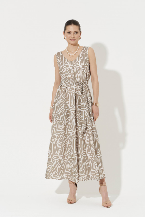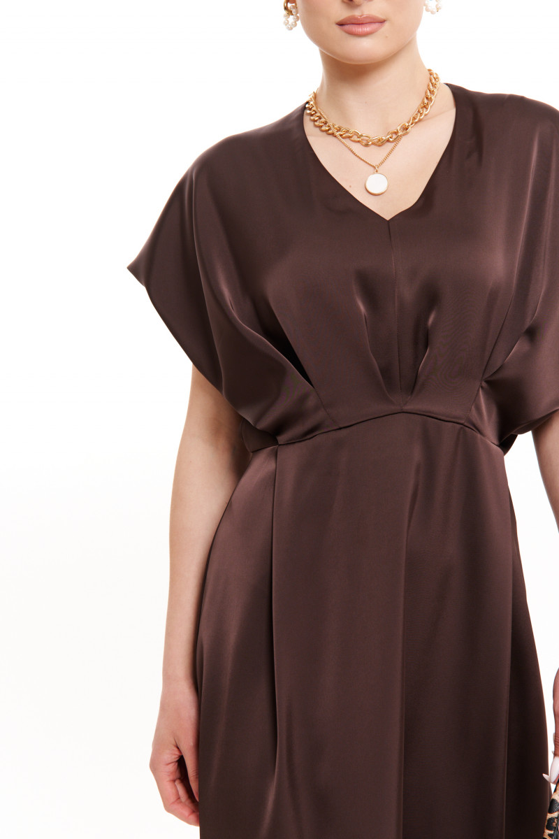 Платье женское из струящейся ткани для повседневной и торжественной носки. Платье полуприлегающего силуэта. платье отрезное по линии талии. Лиф переда имеет средний шов и складки. Лиф спинки имеет складки и средний шов с потайной застежкой молнией. Горловина V-образная. Рукава цельнокроеные, короткие. Юбка платья, расширенная к низу. Переднее полотнище юбки имеет складки. Заднее полотнище юбки со средним швом и вытачками. Платье длиной макси. Платье на вискозной подкладке. Данная модель платья в элегантном коричневом цвете покорит вас своей красотой и великолепной посадкой. В данном платье вы будете выглядеть неотразимо и будете ловить на себе восхищенные взгляды.