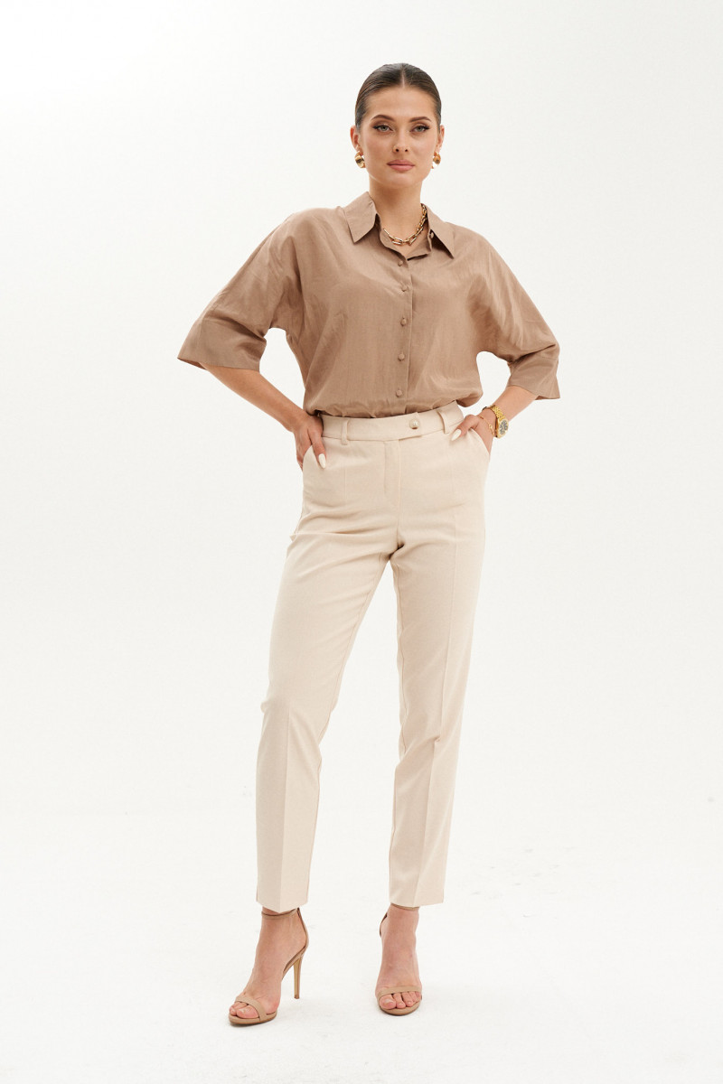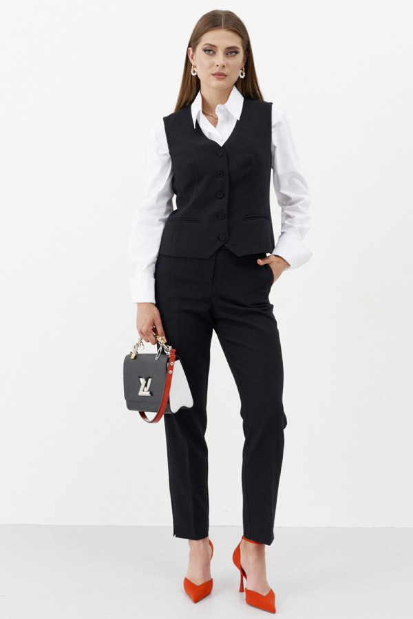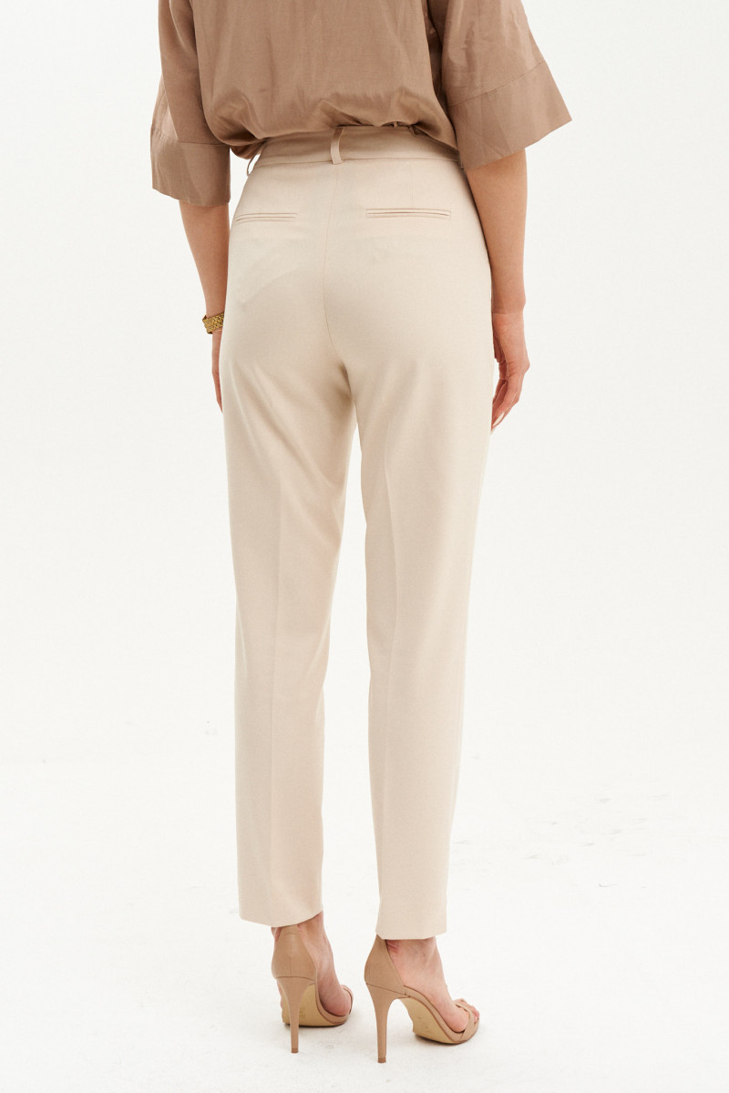 Брюки на поясе с молнией, заужены к низу. Дополнение: укороченные, снизу по бокам брючин выполнены небольшие разрезы, на задней части – прорезные карманы в рамку, есть боковые карманы.