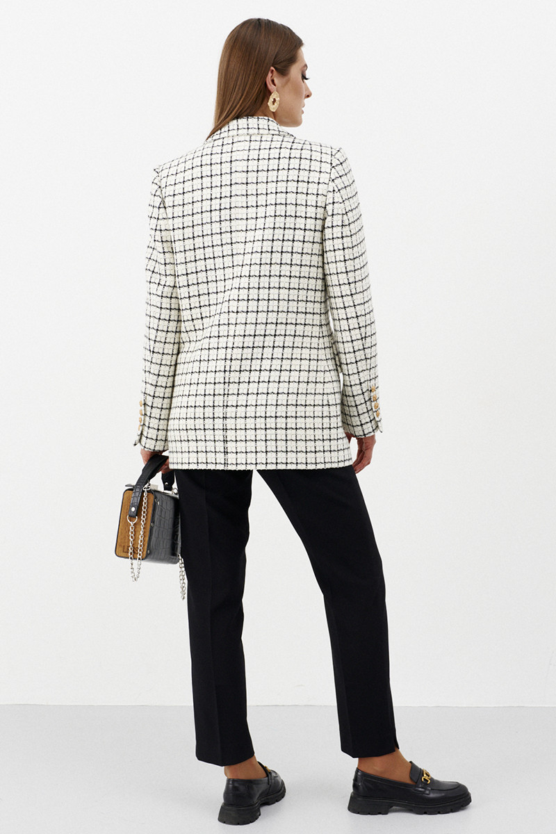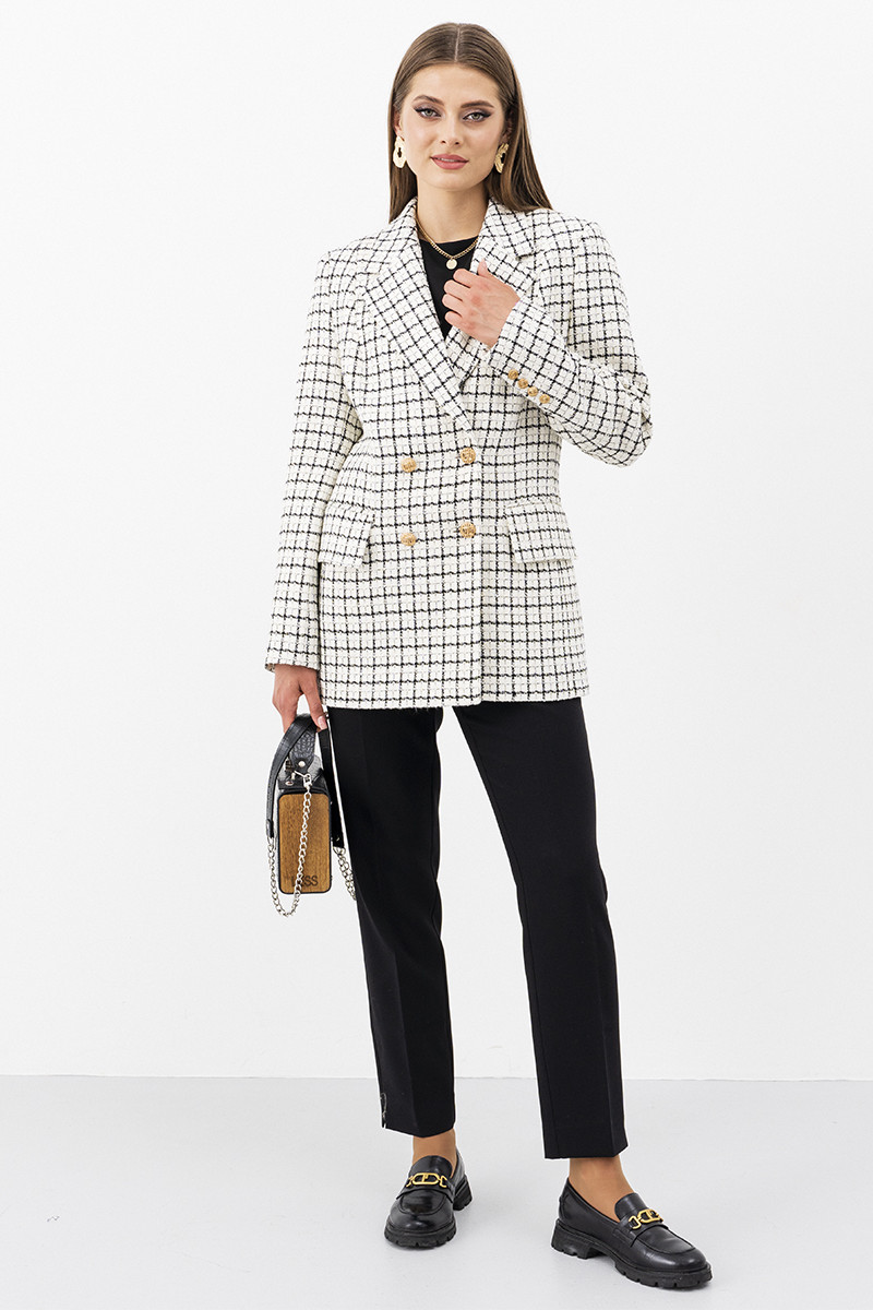 Жакет женский бренда Ketty для повседневной носки, из ткани-твид, на подкладке, полуприлегающего силуэта с втачным рукавом и английским воротником. Перед дополнен двумя прорезными карманами с клапанами. Двубортная застежка на четыре золотые пуговицы. Женский удлиненный жакет создан для стильных девушек и женщин. Длинный базовый пиджак двубортный, как жакет или кардиган, украсит повседневный образ. Модный твидовый пиджак имеет приталенный силуэт. Достаточно объемный, не обтягивающий. Клетчатый пиджак офисный больших размеров будет отлично смотреться на женщинах и девушках разной комплекции. Простой и красивый пиджак на пуговицах сделает вас визуально стройнее и выше. Такая одежда подходит для делового и офисного стиля, вечернего образа, на свидание, на прогулку. Благодаря своему составу, классический пиджак плотный, не мнется.