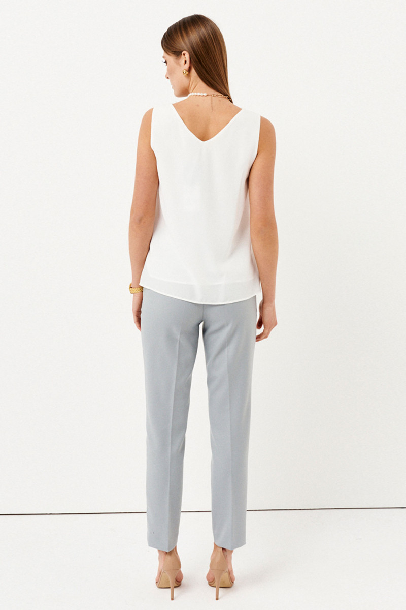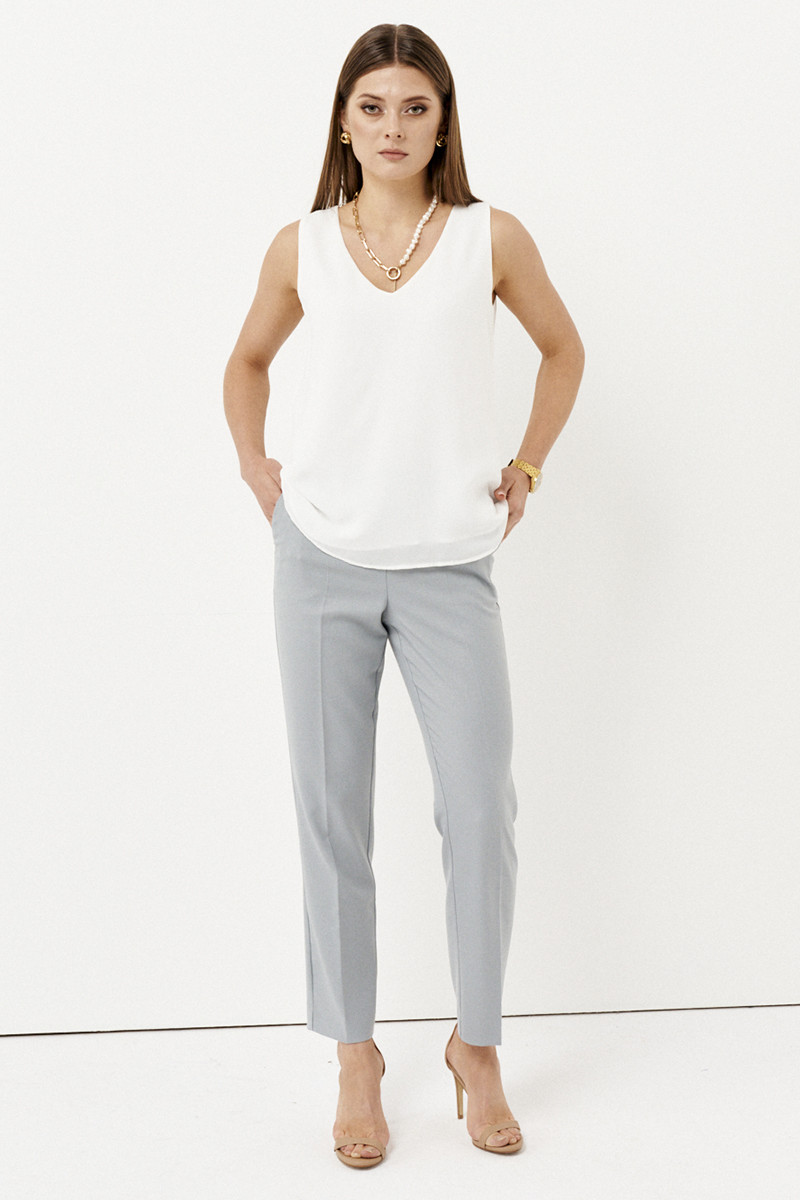 Блузка свободного силуэта из однотонной ткани без рукава на вискозной подкладке. Красивая легкая блузка, слегка расширенная к низу. Стильная вещь, которая отлично сочетается с жакетами, пиджаками и кардиганами. Однотонная блузка станет основой вашего гардероба и разнообразит комплекты повседневной одежды, а также может стать частью вечернего образа.