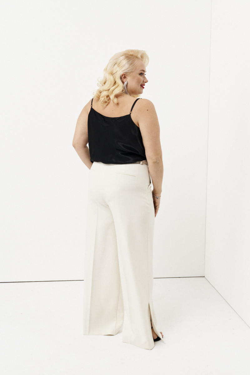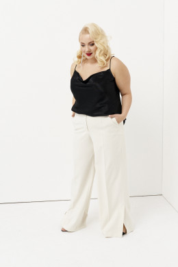| 44 | Брюки: Высота посадки - 28см, Длина брюк без пояса - 109см, Длина по внутреннему шву - 84,5см, Ширина брючин сверху - 66,5см, Обхват брюк по низу - 54,5см, Ширина по бедрам - 48см, Ширина по талии - 35см; |
