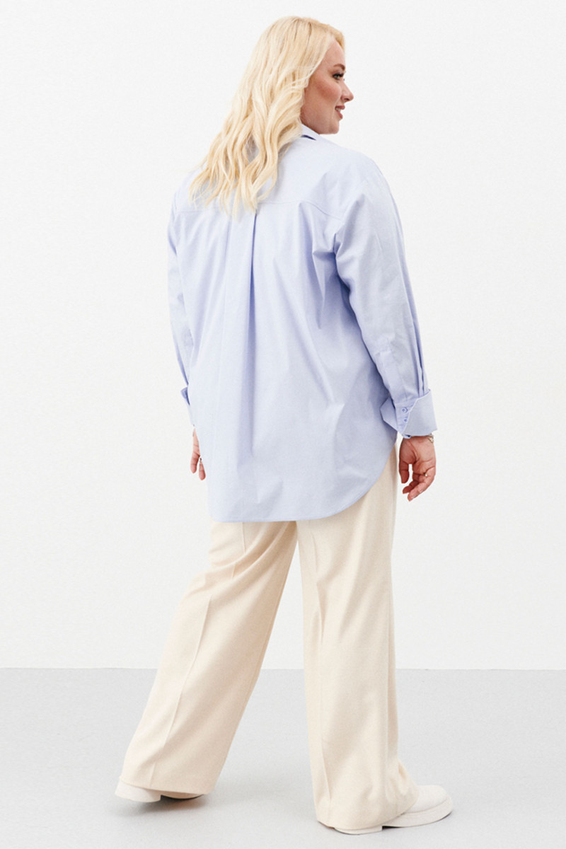 Стильная классическая рубашка от бренда Ketty с необычными модными рукавами. Рукав втачной со средним швом. По низу рукава оформлен высокий отложной манжет, который легко отрегулирует длину рукава. Воротник рубашечный, отложной, на стойке. Застёжка спереди центральная на планку с петлями и пуговицами. Спереди выполнен один нагрудный карман. Спинка длиннее переда, на спинке сделана встречная складка. Линия низа округлая. Прекрасный вариант рубашки для работы в офисе и на каждый день.