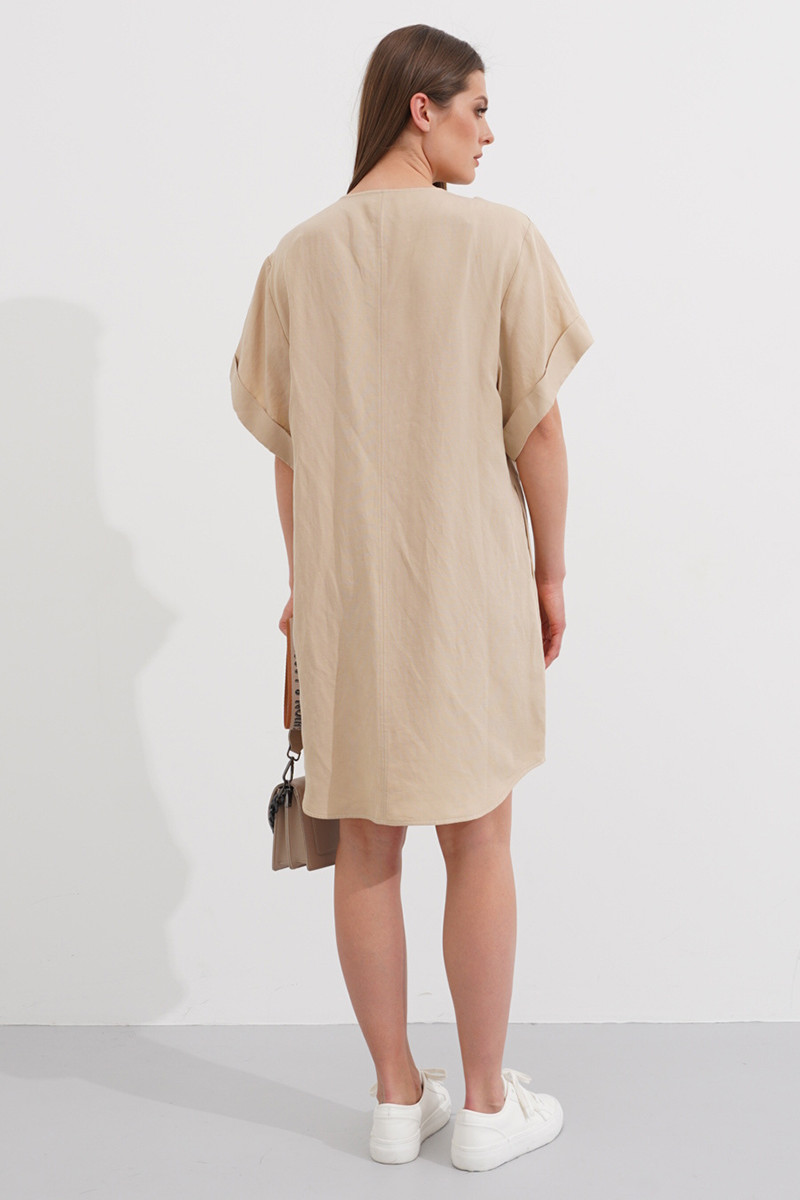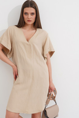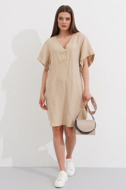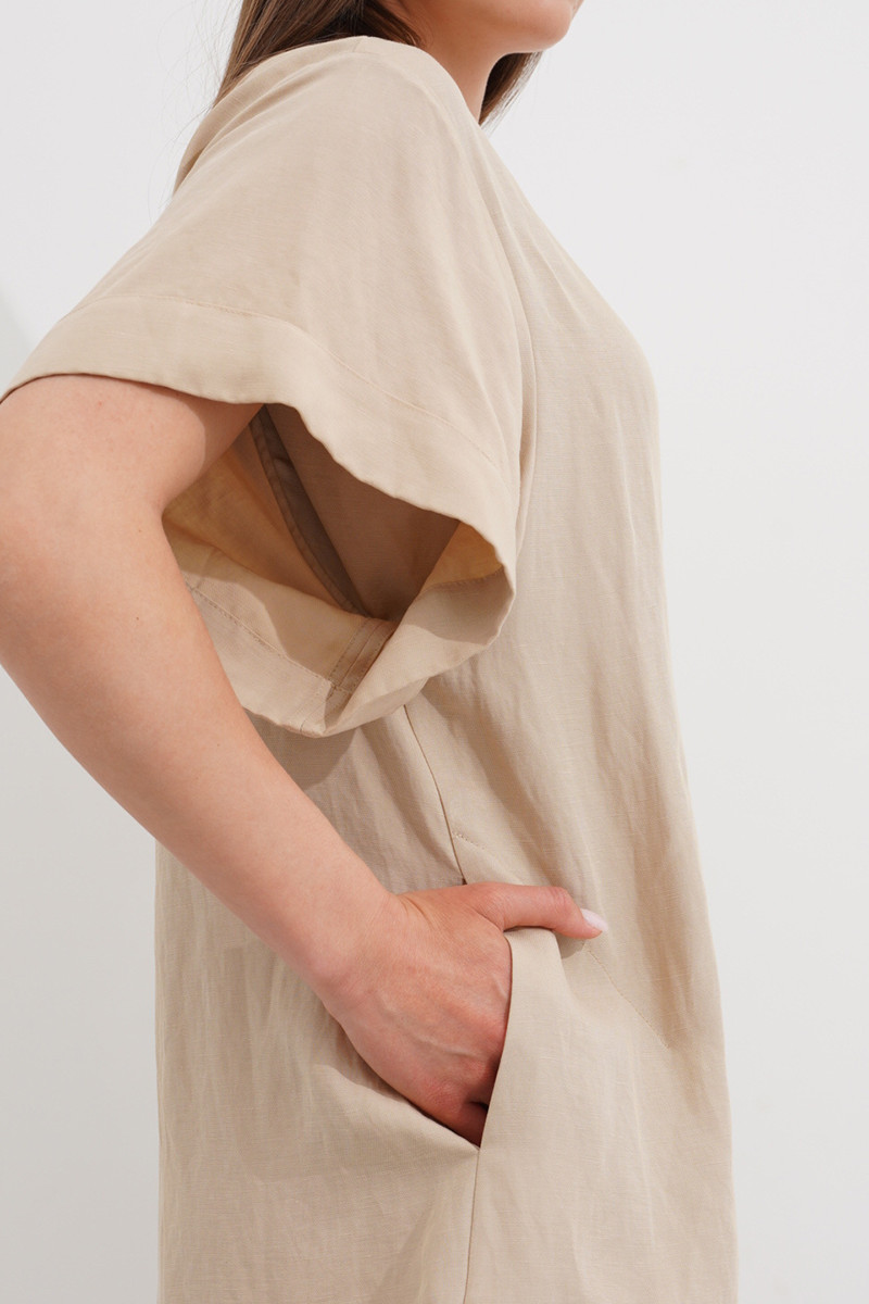 Платье женское из смесовой ткани с добавлением льна для повседневной носки. Платье прямого силуэта. Перед имеет средний шов. Низ по переду и по спинке полукруглый. Горловина обработана планкой в нахлест с V-образной горловиной. Линия плеча чуть спущена. Рукава втачные длинной чуть выше локтя, низ рукава обработан отлетной манжетой. Длина изделия на уровне колена. Легкое и очень стильное платье, которое будет давать настроение на каждый день. Данное платье станет не заменимой вещью в вашем гардеробе, оно обязательно покорит вас своей чудесной посадкой.
