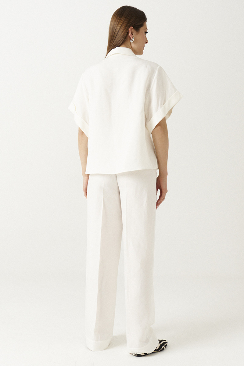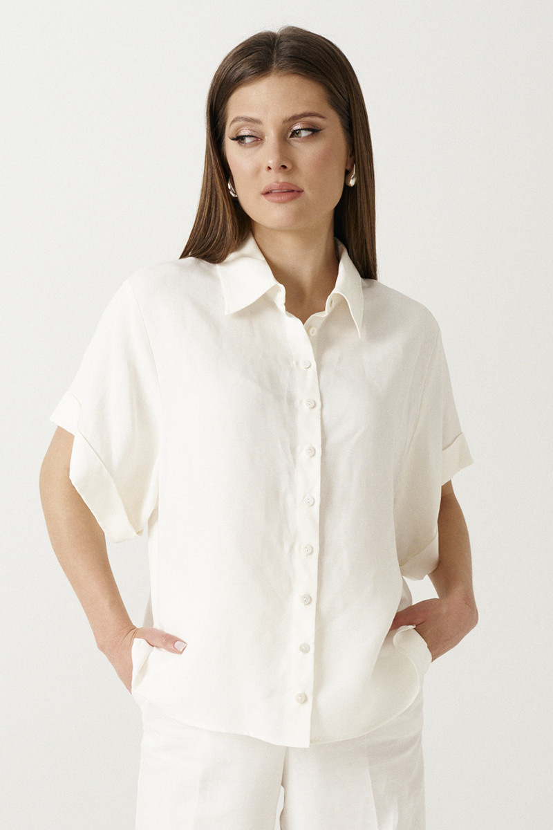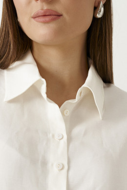 Блузка женская из смесовой ткани с добавлением льна для повседневной носки. Блузка прямого силуэта. Застежка в блузке центральная бортовая на обметанные петли и пуговицы. Горловина обработана рубашечным воротником с отрезной стойкой. Линия плеча чуть спущена. Рукава втачные длинной чуть выше локтя, низ рукава обработан отлётной манжетой. Легкая и очень стильная блузка, которая будет давать настроение на каждый день. Данная блузка станет не заменимой вещью в вашем гардеробе, она обязательно покорит вас своей чудесной посадкой.
