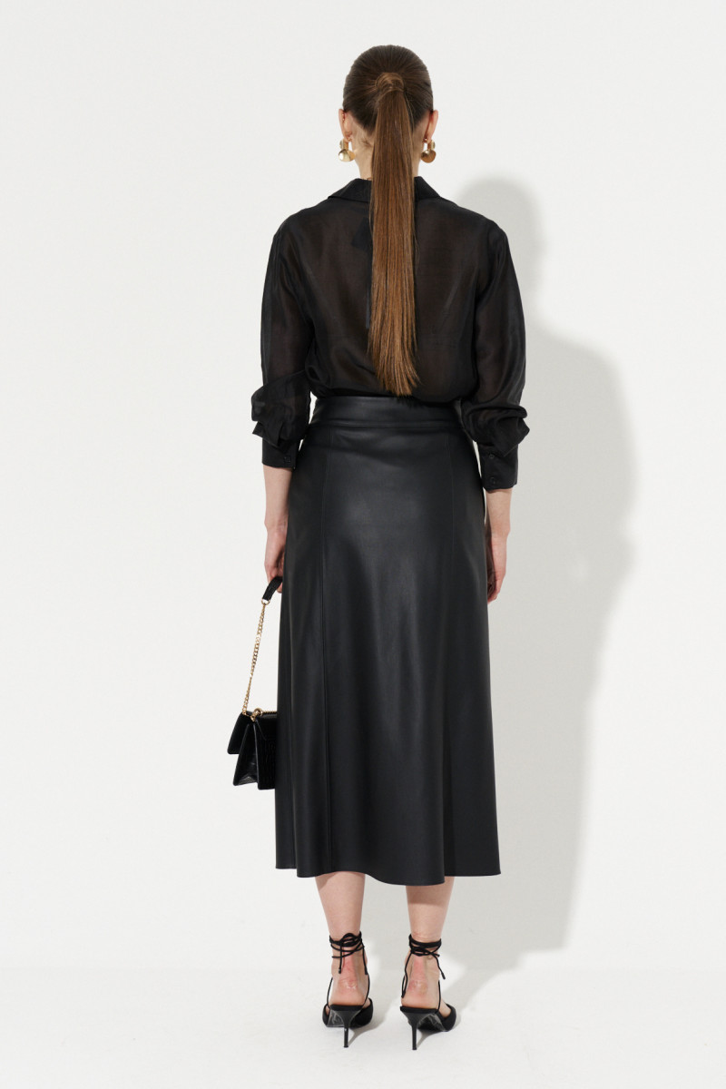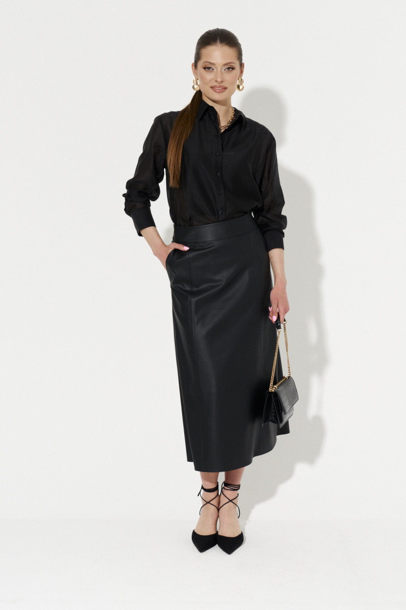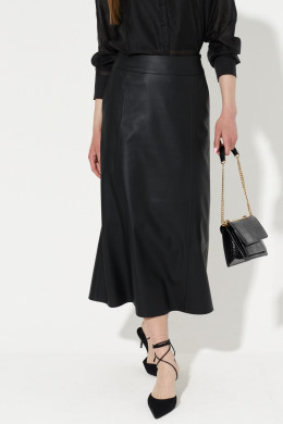 Юбка женская из мягкой экокожи для повседневной носки. Изделие А- силуэта. Верх юбки обработан отрезным поясом-обтачкой. Застежка на потайную молнию в боковом шве. В боковых швах прорезные карманы. По переду и спинке рельефные швы. Юбка на поливискозной подкладке. Длина изделия до середины голени.