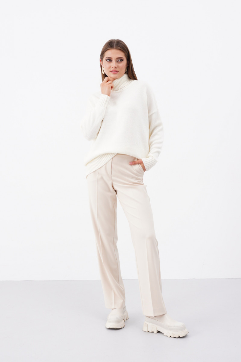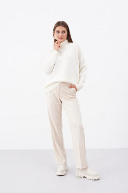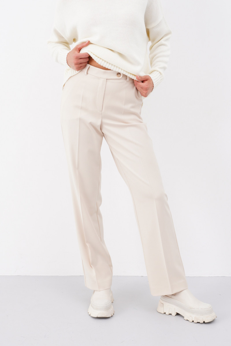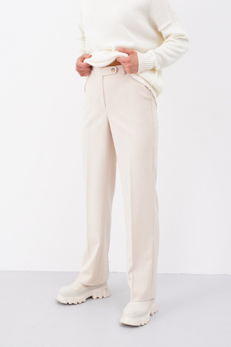 Брюки женские из поливискозной ткани для повседневной носки. Брюки прямого силуэта. Верхний срез брюк обработан притачным поясом с застежкой на одну обметанную петлю и одну пуговицу, а также в среднем шве брюк имеется застежка на тесьму-молнию. Брюки имеют шлевки, что дает возможность носить их под ремень. В боковом шве имеются потайные карманы. Очень нежные и стильные брюки, которые обязательно очаруют вас своей идеальной посадкой. В данных брюках вы будете чувствовать себя уверенно и обязательно будете в центре всеобщего восхищения.