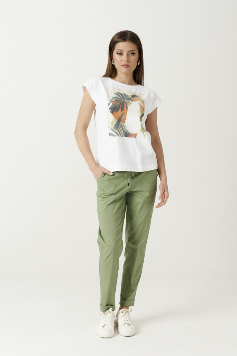 Женские брюки на резинке - это модный и удобный выбор для вашего летнего гардероба! Их крой обеспечивает свободу движений, Брюки слегка зауженные к низу. Пояс отрезной, а резинка по спинке на поясе делает их комфортными для носки. По передней части пояса кулиса со шнурком из основной ткани. К тому же, в боковых швах предусмотрены карманы, что позволит вам хранить необходимые мелочи под рукой. По задним половинками отрезные кокетки и имитация прорезных карманов. По низу отложная манжета