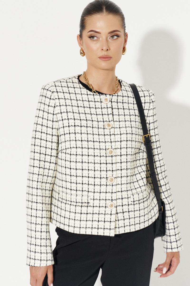 Жакет женский из смесовой ткани в стиле Шанель, прямого силуэта для повседневной и торжественной носки. Застежка в жакете центральная бортовая на четыре обметанные петли и четыре пуговицы. Перед имеет нагрудные вытачки и карманы с листочкой. Задняя часть спинки имеет два вертикальных рельефа идущих от линии плеча до линии низа изделия, а также спинка имеет средний шов. Горловина обработана обтачкой. Рукава втачные длинные. Жакет длиной до линии бедер. Красивый жакет, в котором вы всегда будете в центре внимания.