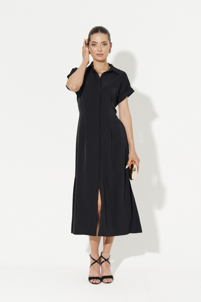 Платье женское из лёгкой струящейся ткани для повседневной носки полуприлегающего силуэта. Перед с талиевыми вытачками. В платье имеется центральная бортовая супатная застежка на обметанные петли и пуговицы. В боковом шве имеются разрезы до низа изделия, а также в области талии располагаются петли, через которые протянута завязка для регулировки талии. Спинка с талиевыми вытачками. Горловина обработана рубашечным воротником на стойке. Рукав цельнокроеный, короткий. Линия плеча слегка спущена. Красивое и очень удобное платье, которое станет вашим фаворитом.