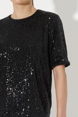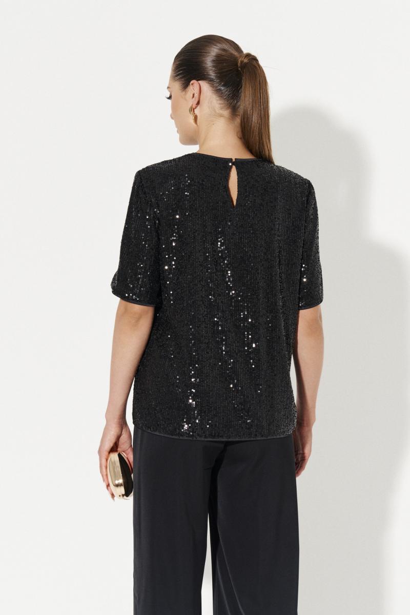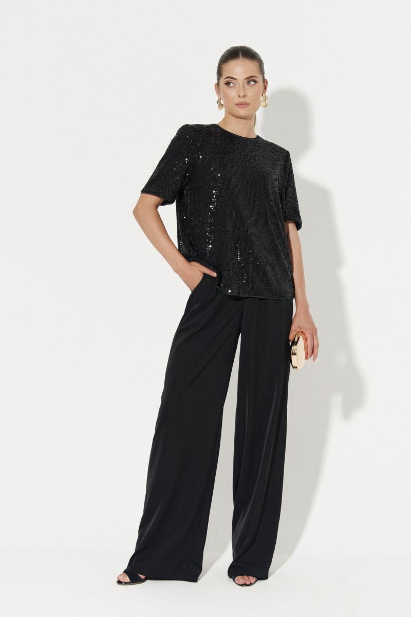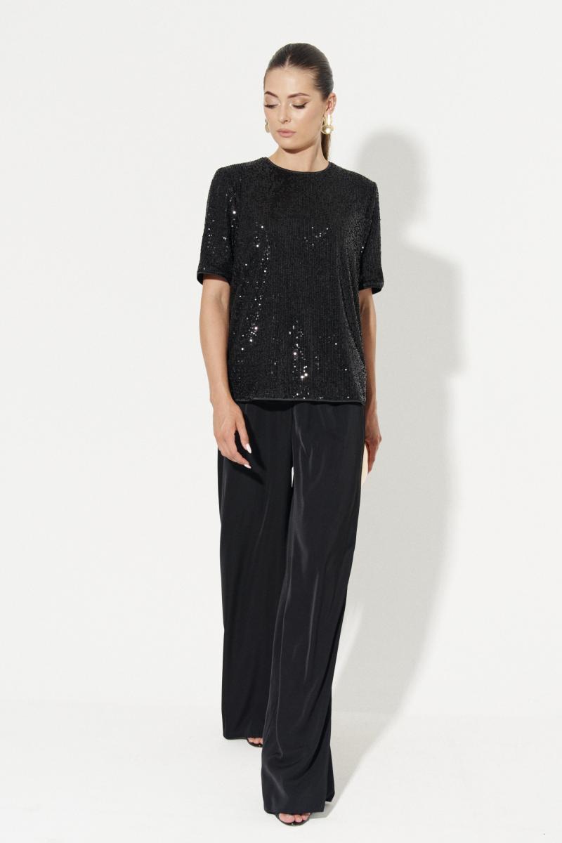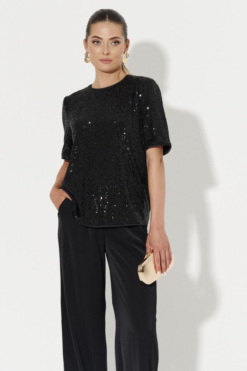 Блузка женская прямого силуэта для повседневной носки. Блузка с пайетками. Спинка с средним швом и застежкой-молнией в шве. Низ изделия обработан окантовочной сеткой. Горловина обработана окантовочной сеткой. Рукава втачные чуть ниже локтя, низ рукава обработан окантовочной сеткой. Блузка на вискозной подкладке. Очень красивая и элегантная блузка, которая будет отлично сидеть на любой фигуре.