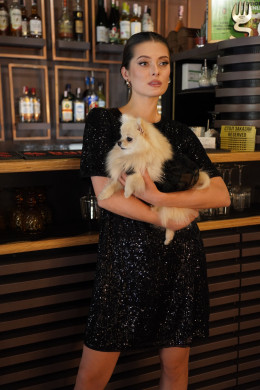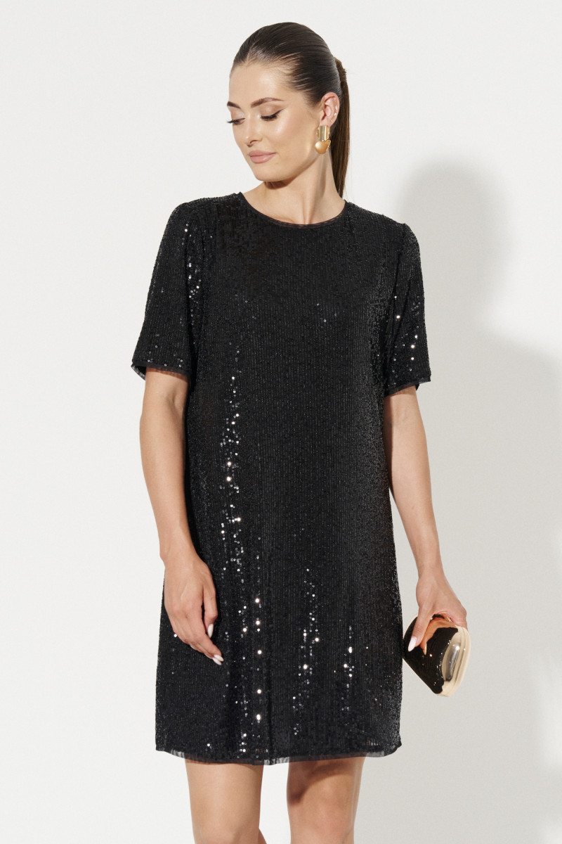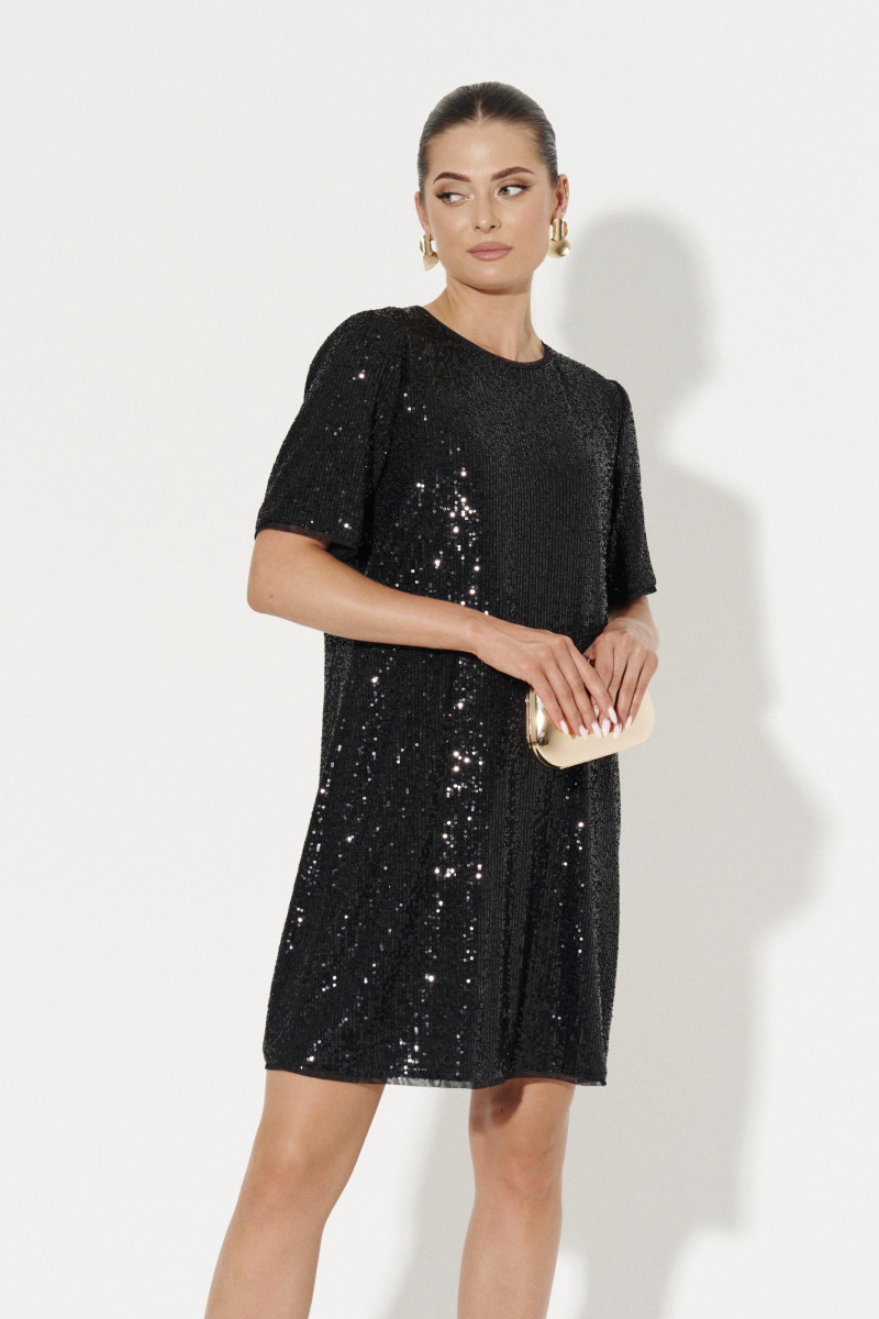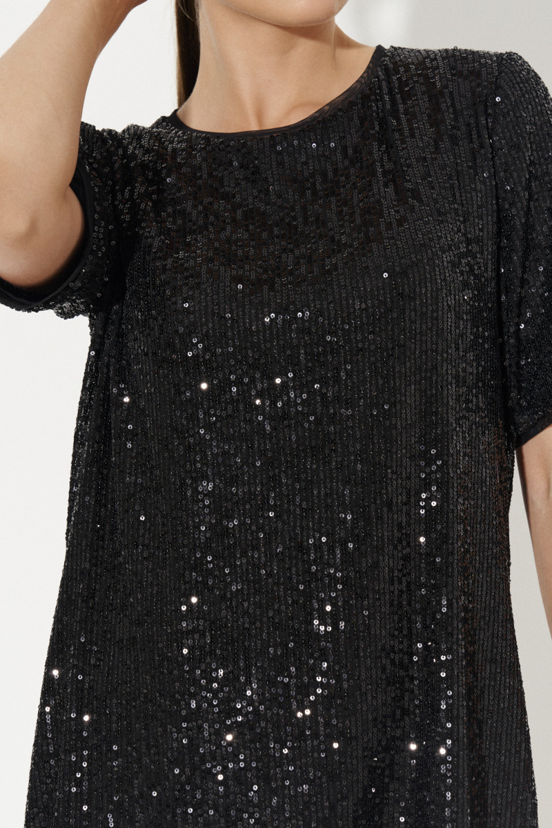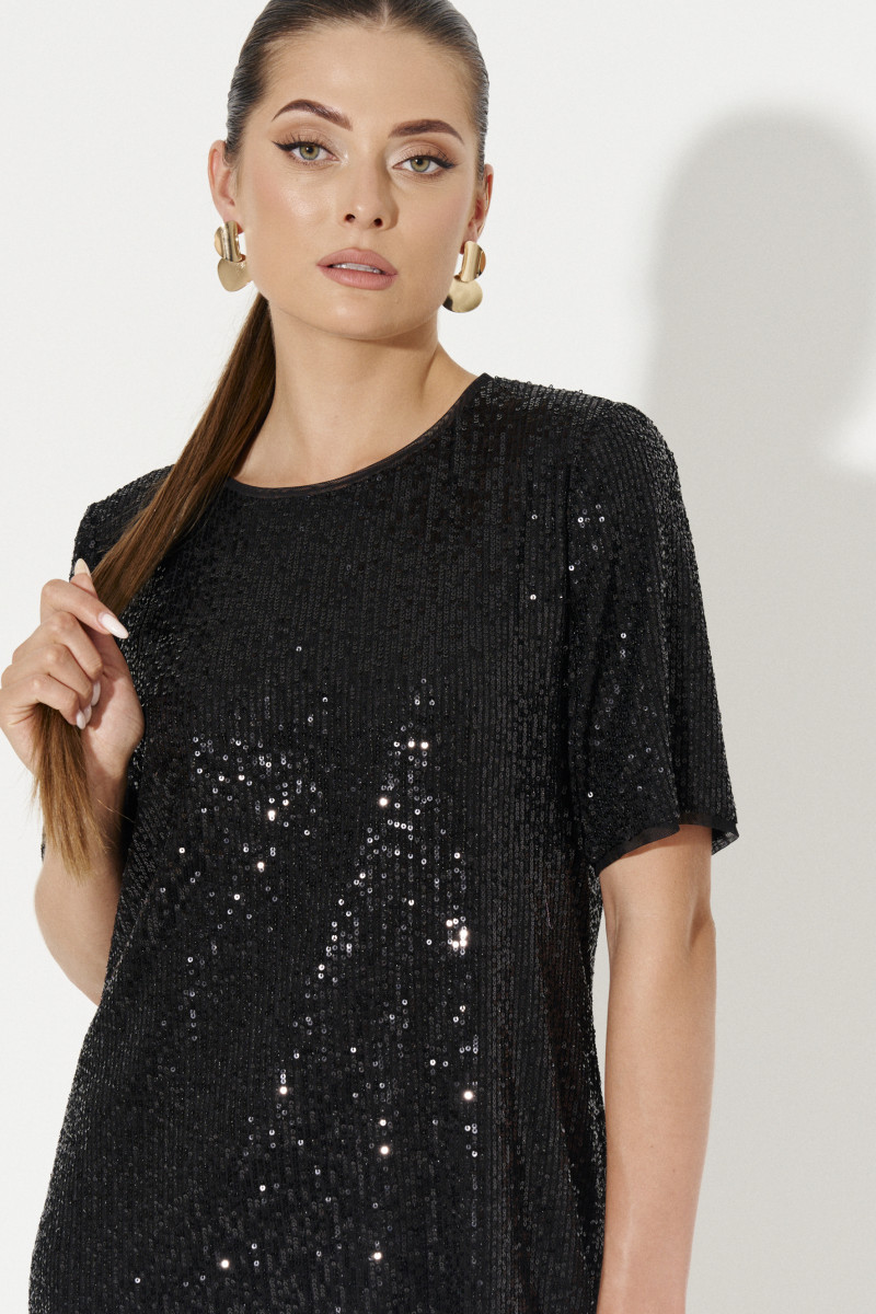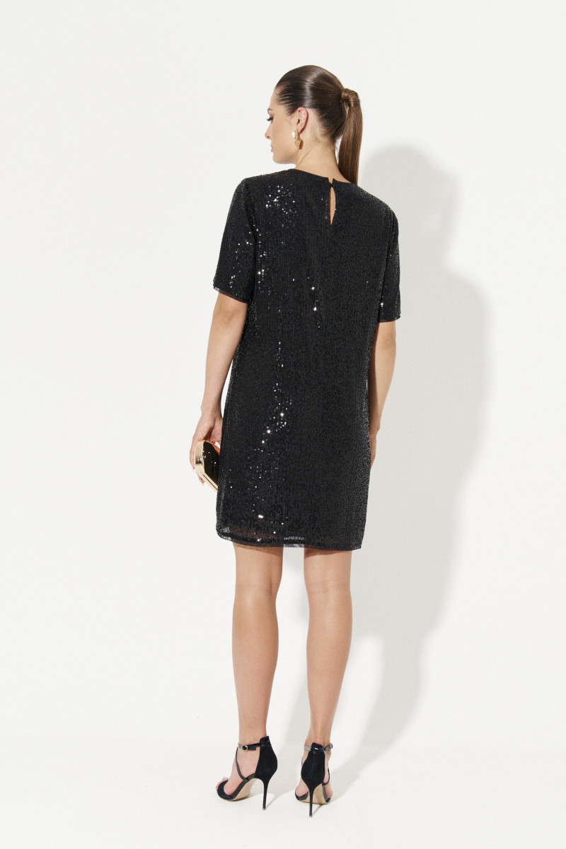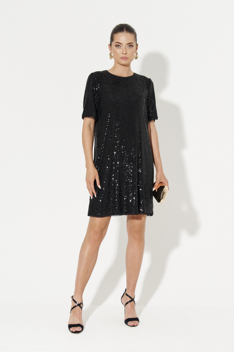 Платье женское из ткани с пайетками прямого силуэта для торжественных случаев. Горловина круглая. Рукав короткий. Низ рукава и низ платья обработан кантом из сетки. Платье полностью на подкладке. Подкладка вискозная, очень приятная к телу. Очень изысканное платье на все случаи жизни, комфортное в носке и с безупречной посадкой по телу.