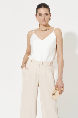 Брюки женские прямые из лёгкой струящейся ткани. Верхний срез брюк обработан притачным поясом с вставкой на резинке по задней части брюк, застежка на одну обметанную петлю и одну пуговицу, а также имеется застежка на тесьму-молнию в среднем шве брюк. Передняя часть брюк имеет четыре талиевых вытачки. Задняя часть брюк имеет две талиевые вытачки и прорезной карман в рамку. В брюках расположен в боковом шве прорезной карман. Брюки подойдут для повседневной носки либо для торжественных случаев. Отличный классический вариант брюк, которые будут гармонично смотреться под любые изделия.