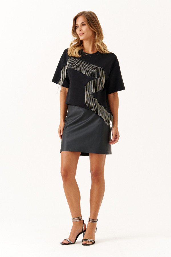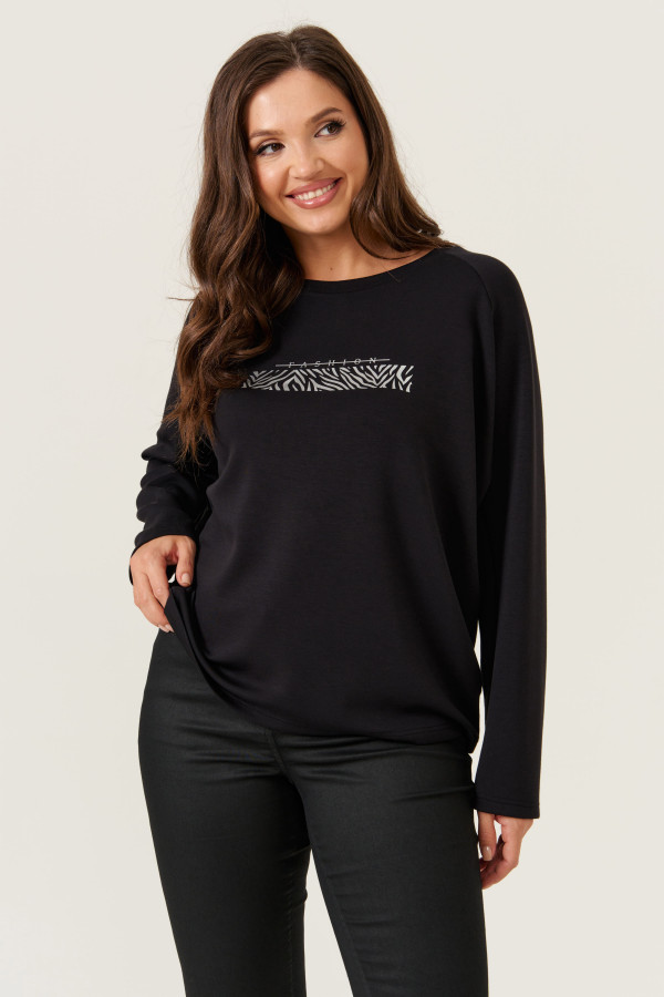 Особую привлекательность модели придает дизайнерская аппликация на передней части — изображение изысканной девушки в нарядном платье из фатина с поясом в виде цепочки и стильной эмблемой. Этот нарядный элемент украшает джемпер и выделяет его среди других повседневных вещей. Расширенная горловина и рукава на уровне локтя добавляют образу легкости и элегантности. Женский джемпер отлично подойдет тем, кто ценит стиль, комфорт и оригинальные детали в одежде.