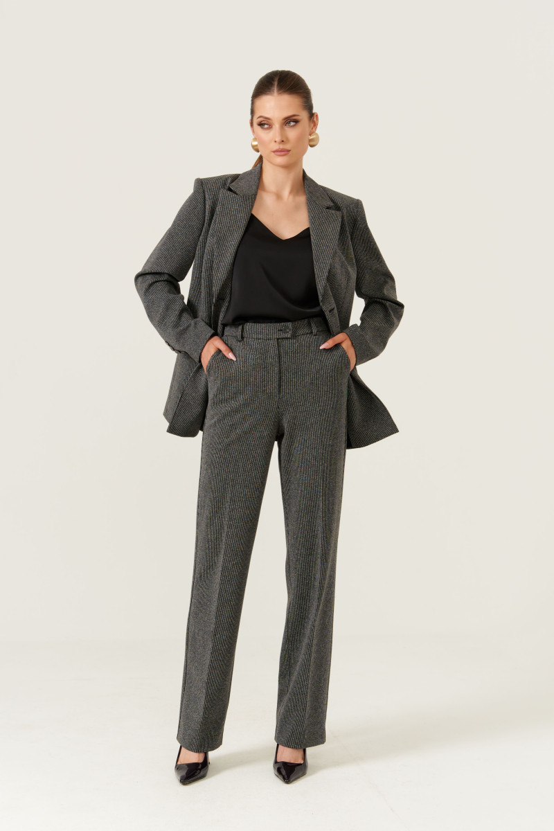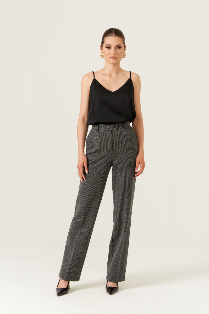 Брюки женские прямые из смесового трикотажного полотна. Верхний срез юбки обработан притачным поясом с застежкой на одну обметанную петлю и одну пуговицу, а также имеется застежка-молния в среднем шве брюк. Срез пояса обработан окантовкой. Пояс со шлёвками, что дает возможность носить брюки под ремень. Задняя часть брюк имеет две талиевые вытачки, а также два прорезных кармана в рамку с двумя обтачками. В боковых швах имеются карманы с подкройным бочком. Брюки отлично подойдут для разного рода мероприятий. Брюки серого оттенка отлично будут смотреться под любой образ и радовать вас каждый день. Данные брюки имеют идеальную посадку за счёт чего они превосходно будут сидеть на любой фигуре.