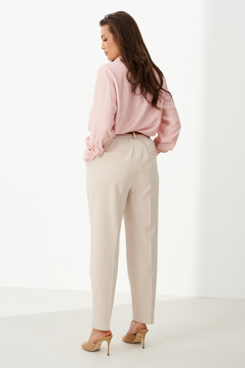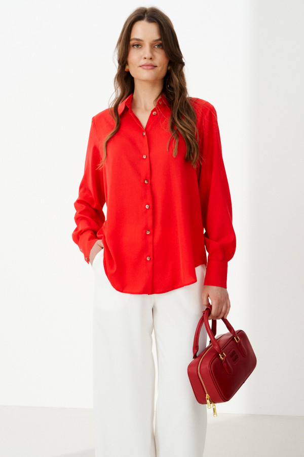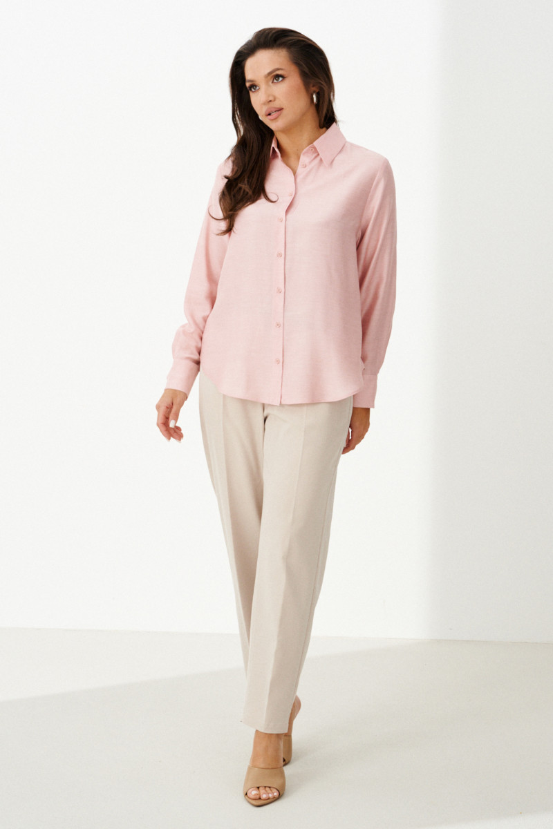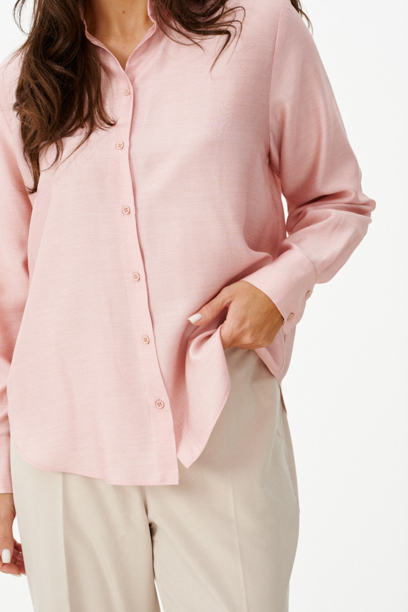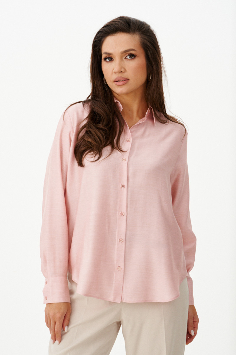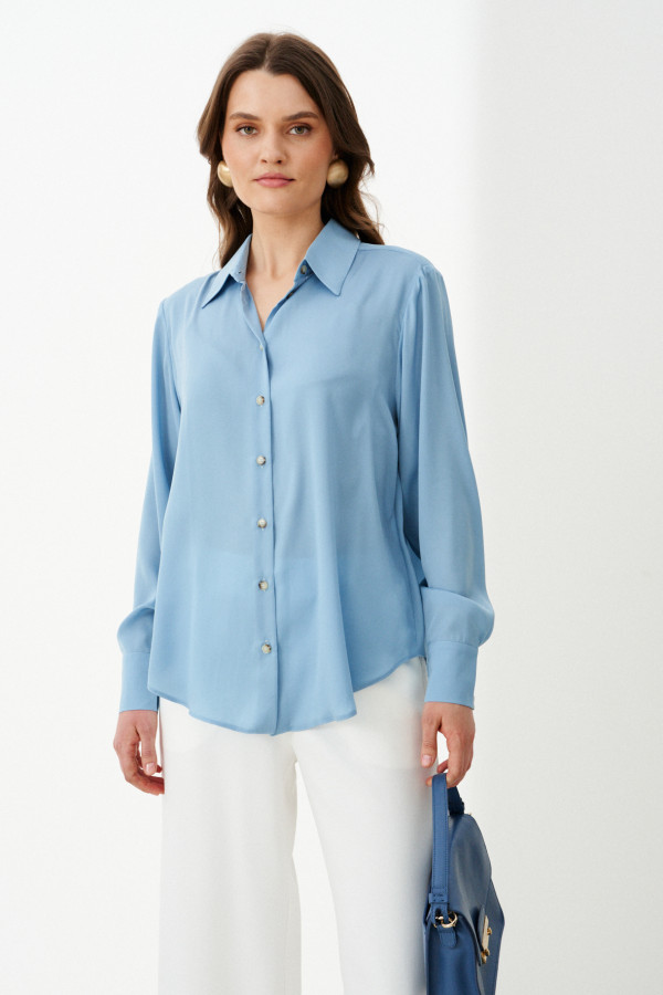 Эта стильная женская блузка нежного оливкового оттенка идеально подойдет для повседневной носки. Выполненная в прямом силуэте, она обеспечивает комфорт и свободу движений. Ткань поливискозная, струящаяся, что придает изделию легкость и изящность. Перед украшен центральной бортовой застежкой на обметанные петли и пуговицы, а низ изделия выполнен с закругленным краем, добавляя изящества образу. Горловина оформлена классическим рубашечным воротником, а рукава завершены притачными манжетами с застежками на две обметанные петли и пуговицы — практично и стильно. Эта очень легкая и практичная блузка станет отличным выбором для ежедневных образов, сочетая комфорт с элегантностью и привлекательностью.