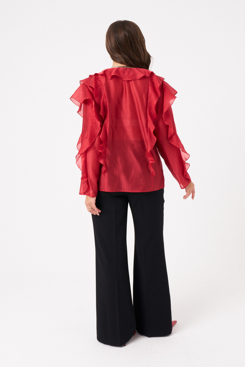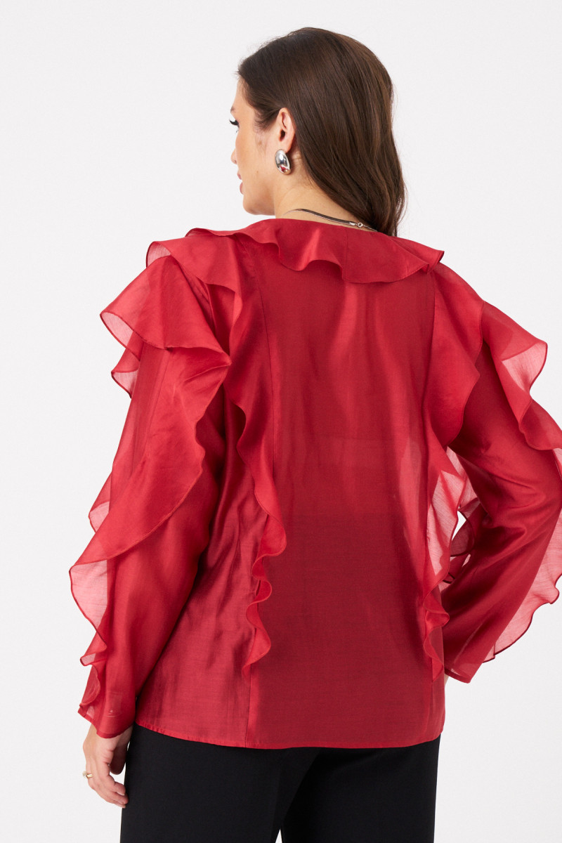 Длинные втачные рукава украшены воланами по линии проймы и вдоль рукава, создавая легкий объем и динамику движения. Такая отделка подчеркивает воздушность модели и делает ее особенно привлекательной.