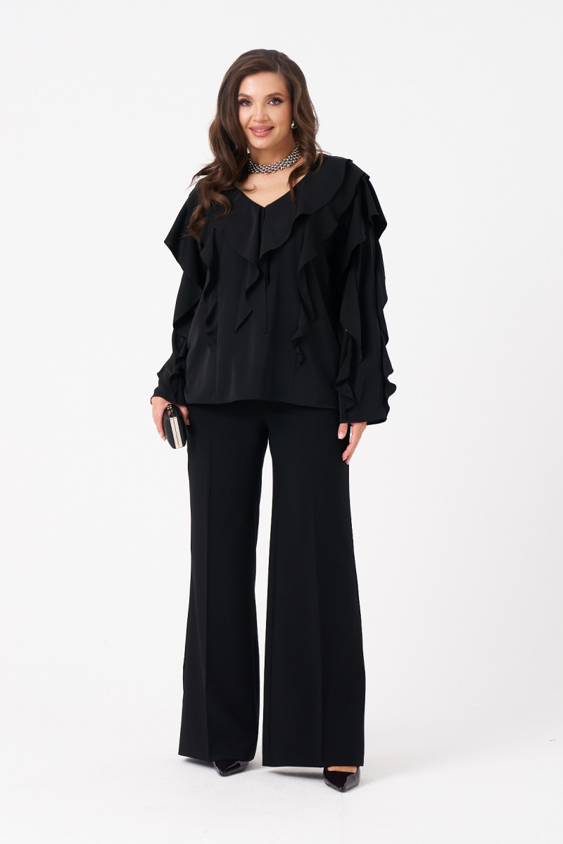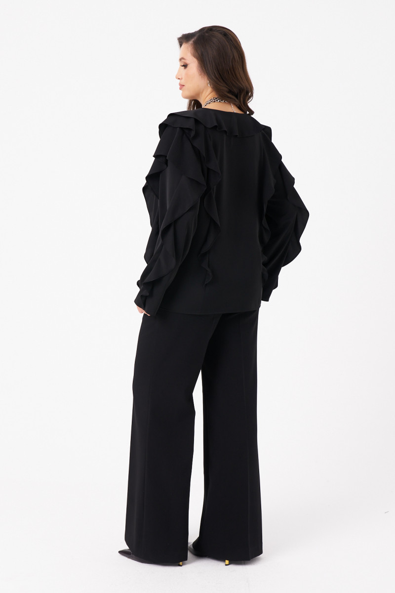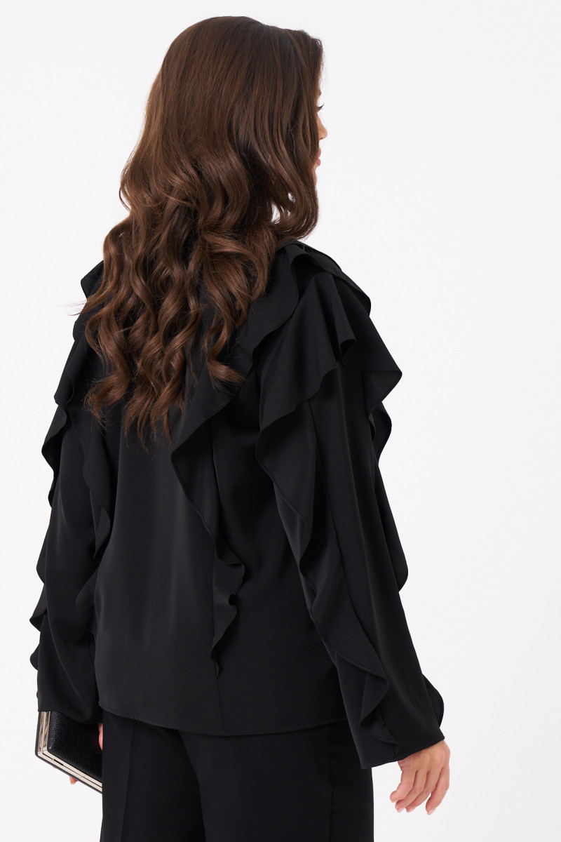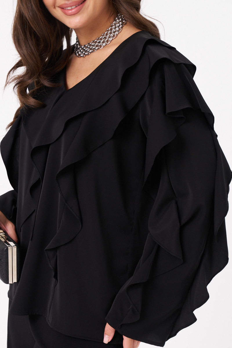 Эта блузка чёрного оттенка идеально подойдет для повседневных образов — она сочетает комфорт, стиль и женственность, позволяя выглядеть элегантно в любой ситуации.