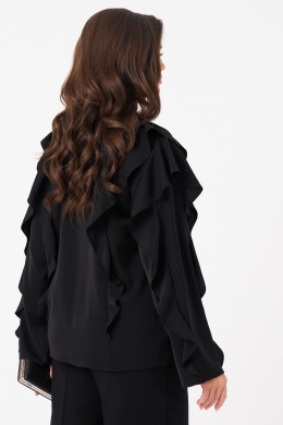 Длинные втачные рукава украшены воланами по линии проймы и вдоль рукава, создавая легкий объем и динамику движения. Такая отделка подчеркивает воздушность модели и делает ее особенно привлекательной.