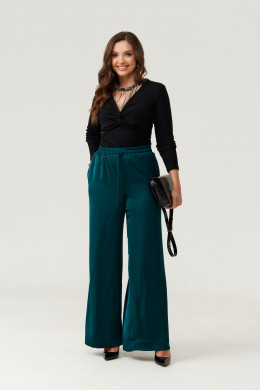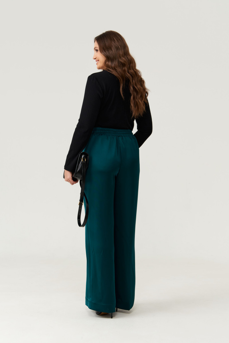 Брюки женские прямые из струящейся атласной ткани. Верхний срез брюк обработан притачным поясом, Пояс на резинке, по переду имеется отрезная прямая часть. В пояс вставлены завязки, за счет чего вы сможете регулировать облегание в области талии. На концах шнурков металлические наконечники. В брюках в боковом шве имеются потайные боковые карманы, что очень удобно. Брюки для повседневной носки либо для торжественных случаев. Модные и очень практичные брюки в изумрудном цвете станут базовой вещью в вашем гардеробе.