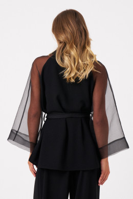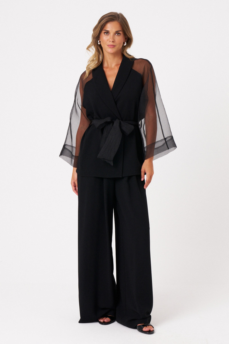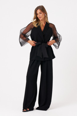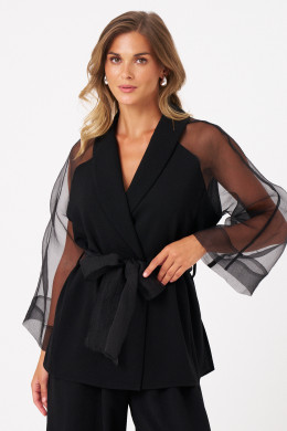 Женский жакет из струящейся ткани, идеально подходящий для торжественных случаев. Модель выполнена с центральной бортовой застежкой на обметанные петли и пуговаицы, что придает ей аккуратный и элегантный вид. Передняя часть украшена двумя рельефами, идущими от проймы до линии низа, что создает интересные линии и добавляет объемности силуэту. В боковых швах расположены небольшие разрезы, обеспечивающие свободу движений и комфорт при носке. Также в боковых швах вставлены шлевки, позволяющие дополнительно закрепить пояс или использовать их для декоративных целей. Горловина оформлена воротником-шаль, придающим образу мягкость и изящность. Рукава -- реглан, выполнены из прозрачной ткани добавляют легкости и романтичности образу. Жакет комплектуется поясом из основной ткани, который подчеркивает талию и создает женственный силуэт.