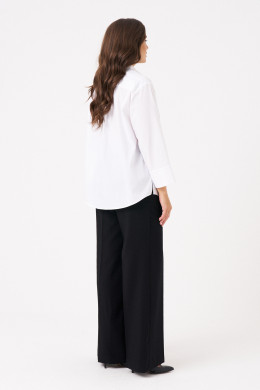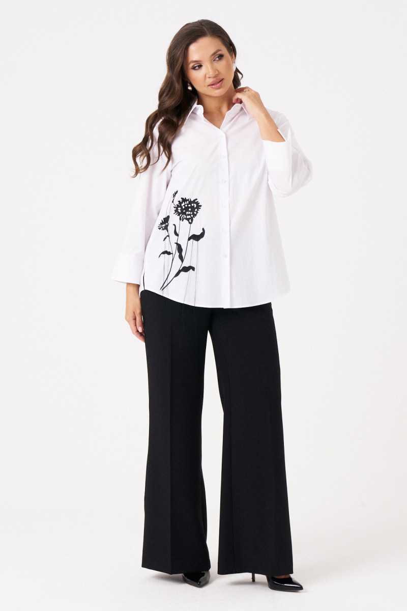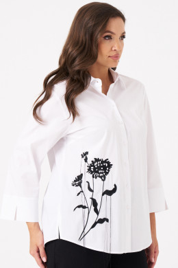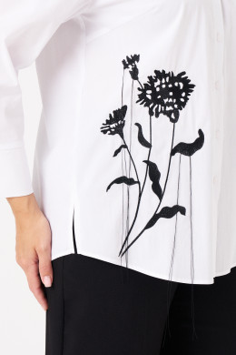 Это женская блузка из смесовой ткани с высоким содержанием хлопка, обеспечивающей комфорт и приятные тактильные ощущения. Модель выполнена с центральной застежкой, закрепленной на обметанных петлях и пуговицах, что придает ей классический и аккуратный вид. Перед украшен дизайнерской вышивкой в виде цветов, что добавляет изделию оригинальности и эстетической привлекательности. Перед имеет две нагрудные вытачки. Спинка с кокеткой и заложенными складками что делает данную блузку очень практичной и удобной. В боковых швах расположены небольшие разрезы, обеспечивающие свободу движений и удобство при носке. Горловина оформлена рубашечным воротником с отрезной стойкой, создавая структурированный и элегантный силуэт. Рукава втачные длинные, низ рукава обработан притачной манжетой, что делает дизайн завершенным и практичным. Эта блузка отлично подойдет для повседневных образов, сочетая комфорт, стиль и оригинальные декоративные элементы.