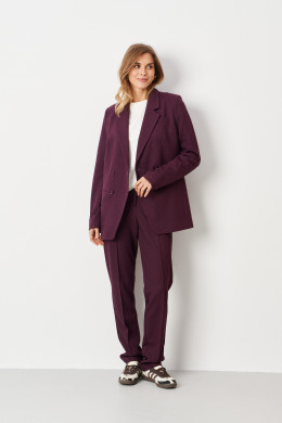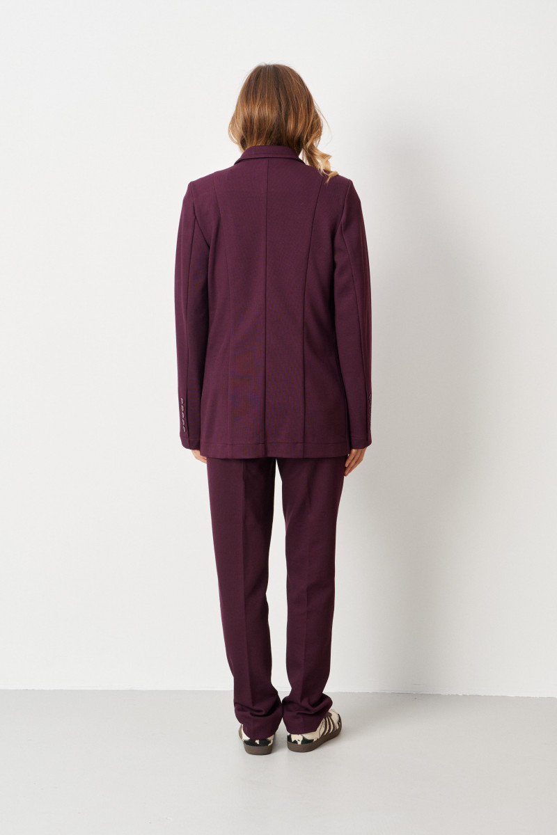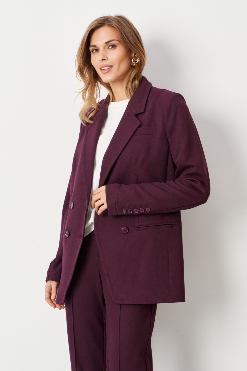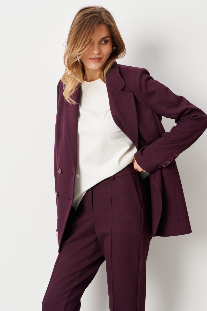 Жакет женский из трикотажа бордового цвета. Стильный жакет полуприлегающего силуэта из мягкого трикотажного полотна — идеальный выбор для повседневной носки и деловых встреч. Модель двубортная с застежкой на две обметанные петли и две пуговицы, оформленная криволинейной линией борта, которая придает образу элегантность и современность.