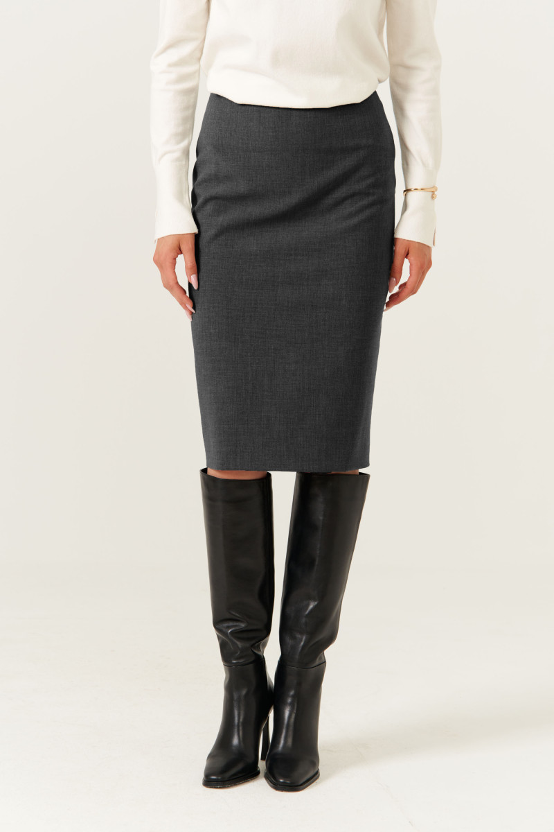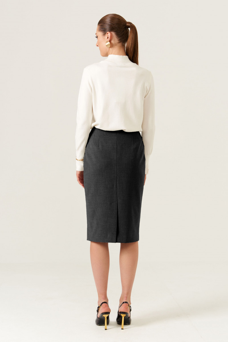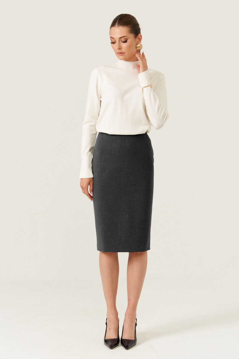 Женская юбка из смесовой ткани для повседневной носки. Полуприлегающий силуэт обеспечивает комфорт и стильный внешний вид. Верхний срез юбки обработан обтачкой, что придает изделию аккуратный и завершенный вид. Заднее полотнище имеет четыре талиевые вытачки для лучшей посадки и формы, а также располагается средний шов с потайной застежкой-молнией обеспечивает удобство при надевании и снятии юбки. На заднем полотнище в среднем шве расположен разрез-шлица, добавляющий свободу движений и стильный акцент. Юбка выполнена на подкладке, что обеспечивает комфорт при носке. Цвет — серый, универсальный и легко сочетаемый с различными топами и обувью.