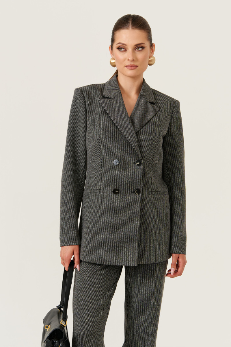 Жакет женский из смесового трикотажного полотна для повседневной носки. Жакет полуприлегающего силуэта. Застежка центральная бортовая на одну обметанную петлю и одну пуговицу. Перед имеет две талиевые вытачки и рельефы, идущие от проймы до линии низа изделия, а также на переде располагается два прорезных кармана с листочкой. Спинка со средним швом и четырьмя рельефами. Рельефы, идущие от плечевого шва и от проймы до низа изделия. Горловина V-образная, обработана воротником стойкой. Рукава втачные длинные. По низу рукава имеется декоративная шлица на обметанные петли и пуговицы. Жакет имеет поливискозную подкладку по переду. Очень стильный жакет, который обязательно не оставит никого равнодушным. В нем вы сможете чувствовать себя модной, а главное очень красивой.