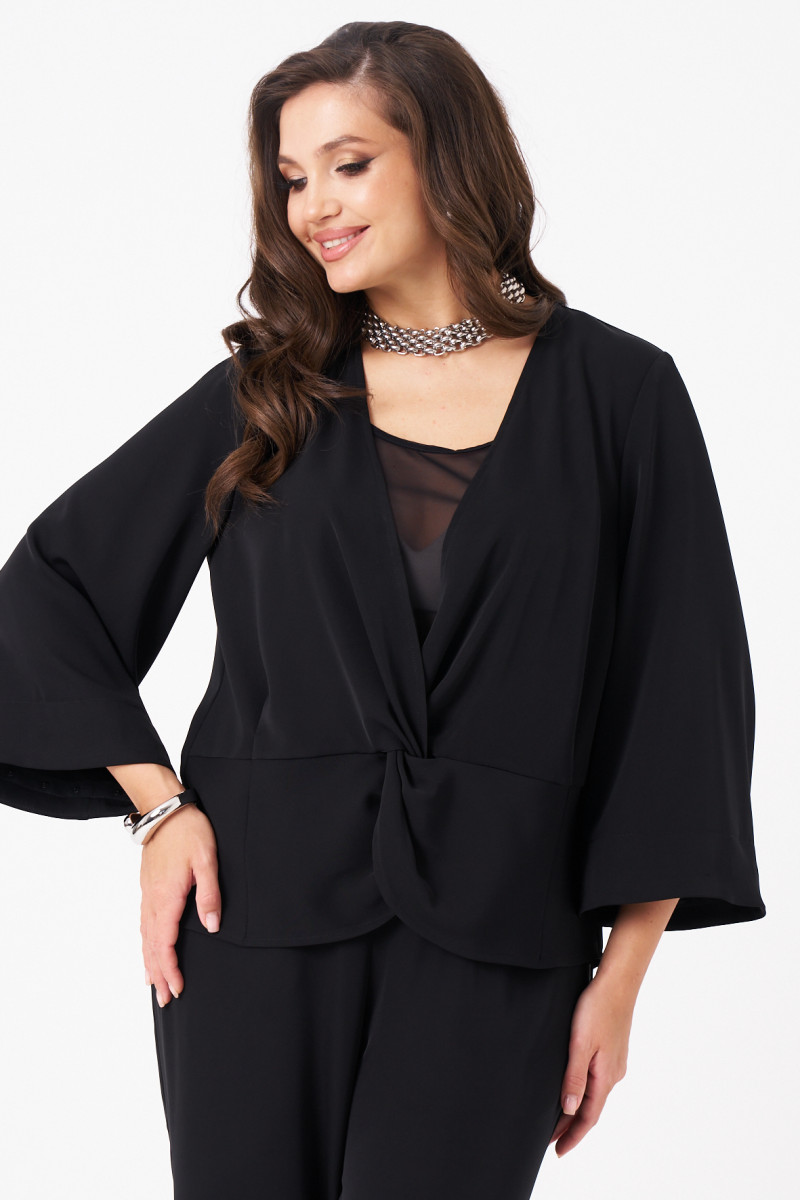 Спинка изделия выполнена со средним швом, что обеспечивает комфортную посадку. Цвет блузки — классический черный, что делает ее универсальной для различных случаев и легко сочетаемой с другими вещами.