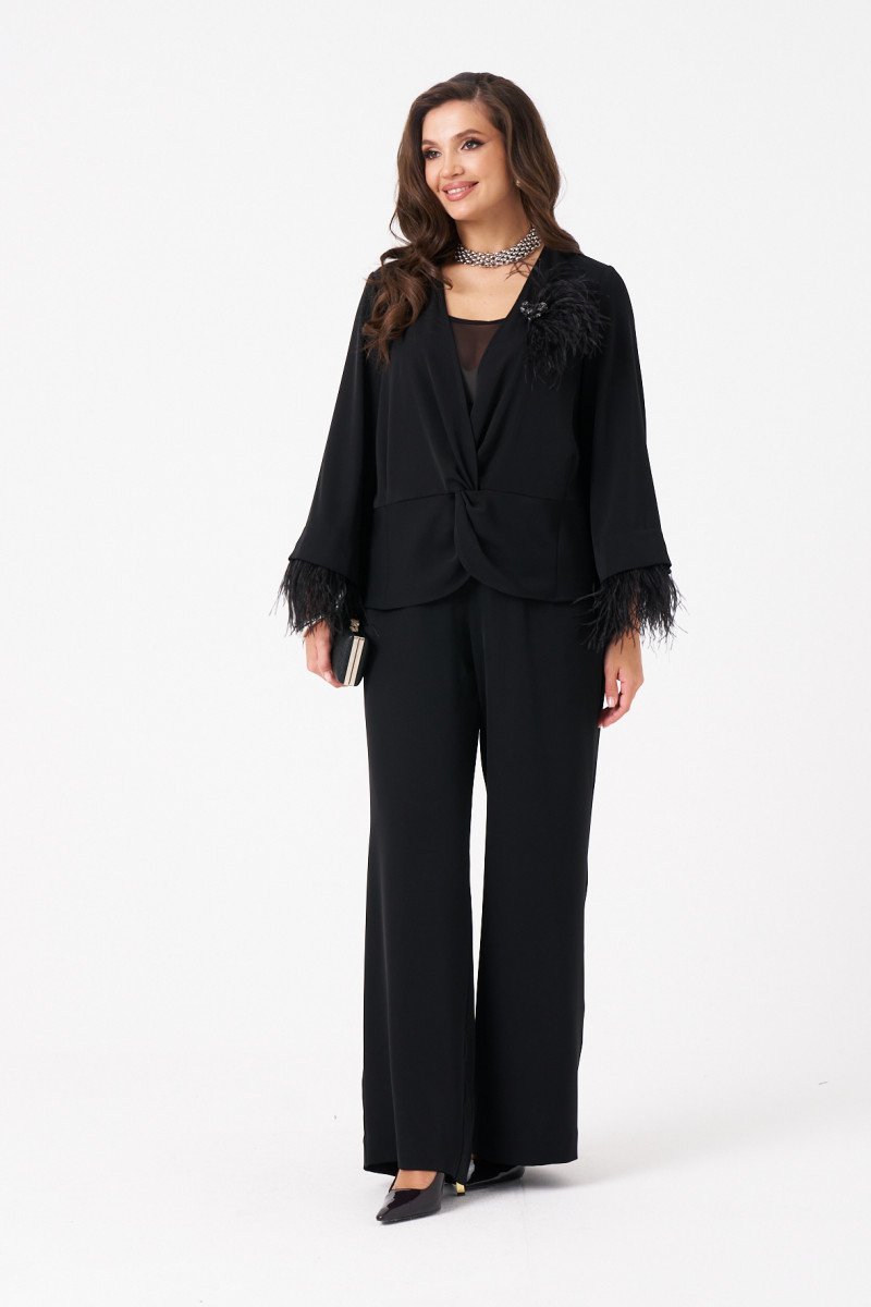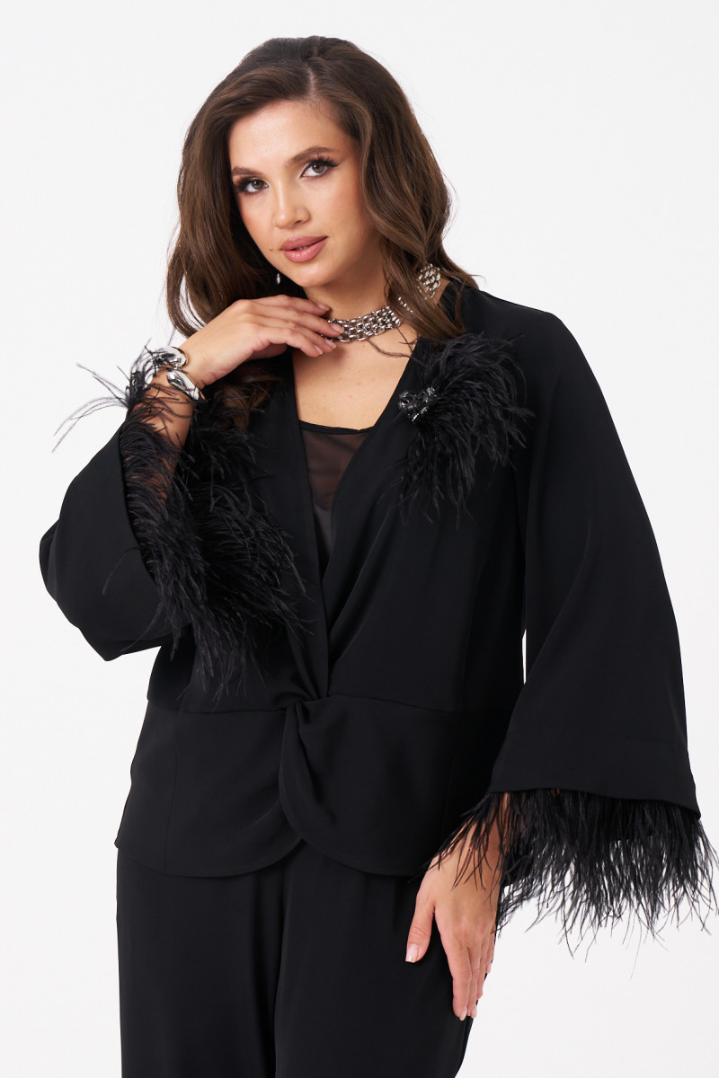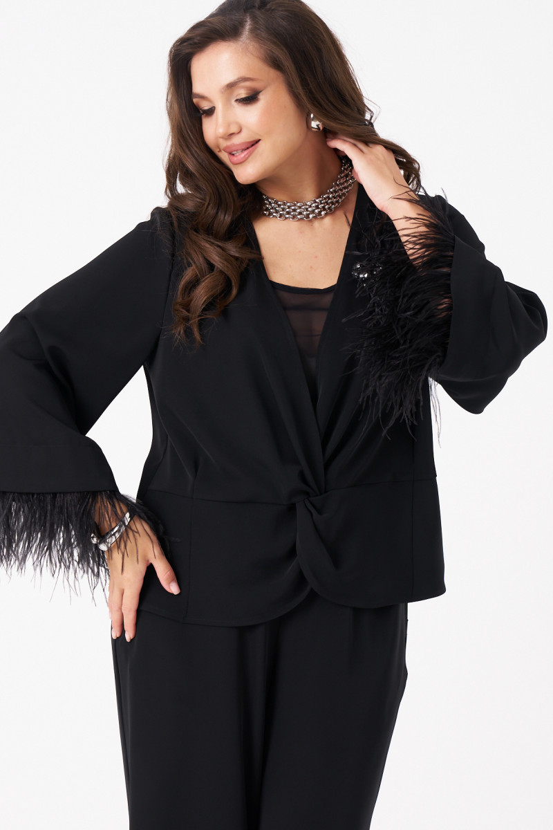 Передняя часть украшена подрезом и перекрутом, создающими красивые складки и придающими изделию изящный вид. Рукава втачные длинные, расширяющиеся к низу, украшены декоративной тесьмой с перьями по краю. Перья крепятся на маленькие кнопки и при желании отстёгиваются дл ясоздания нового образа или для стирки блузки.