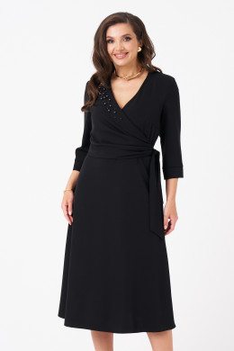 Женское платье из поливискозного волокна, предназначенное для повседневной носки. Модель выполнена в полуприлегающем силуэте с имитацией жакета на запах и отрезной линией талии, что подчеркивает фигуру. Лиф украшен нагрудной вытачкой, а спинка — средним швом с двумя талиевыми вытачками и потайной молнией для удобства. Юбка расширяется к низу, создавая элегантный силуэт. Воротник — V-образный с шалью, украшенной декоративными бусинами и по краю воротника перьями, которые прижелании можно отстегнуть.. Рукава втачные, длиной ниже локтя, обеспечивают комфорт и стиль. Длина платья — макси. Модель выполнена на качественной вискозной подкладке. Изящное платье чёрного цвета подойдёт для торжественных случаев.