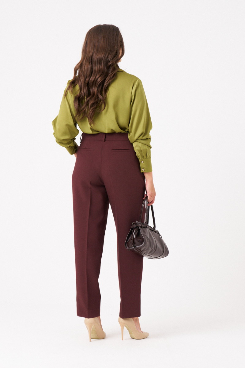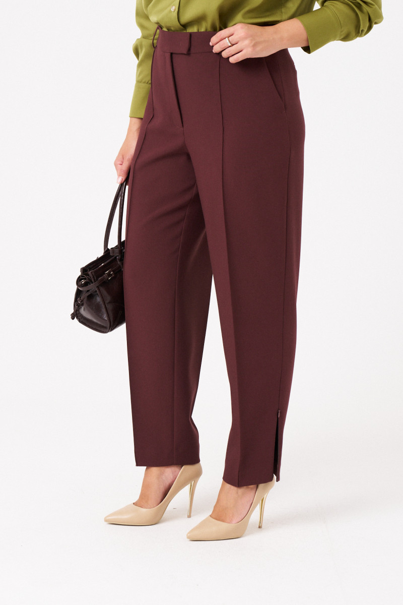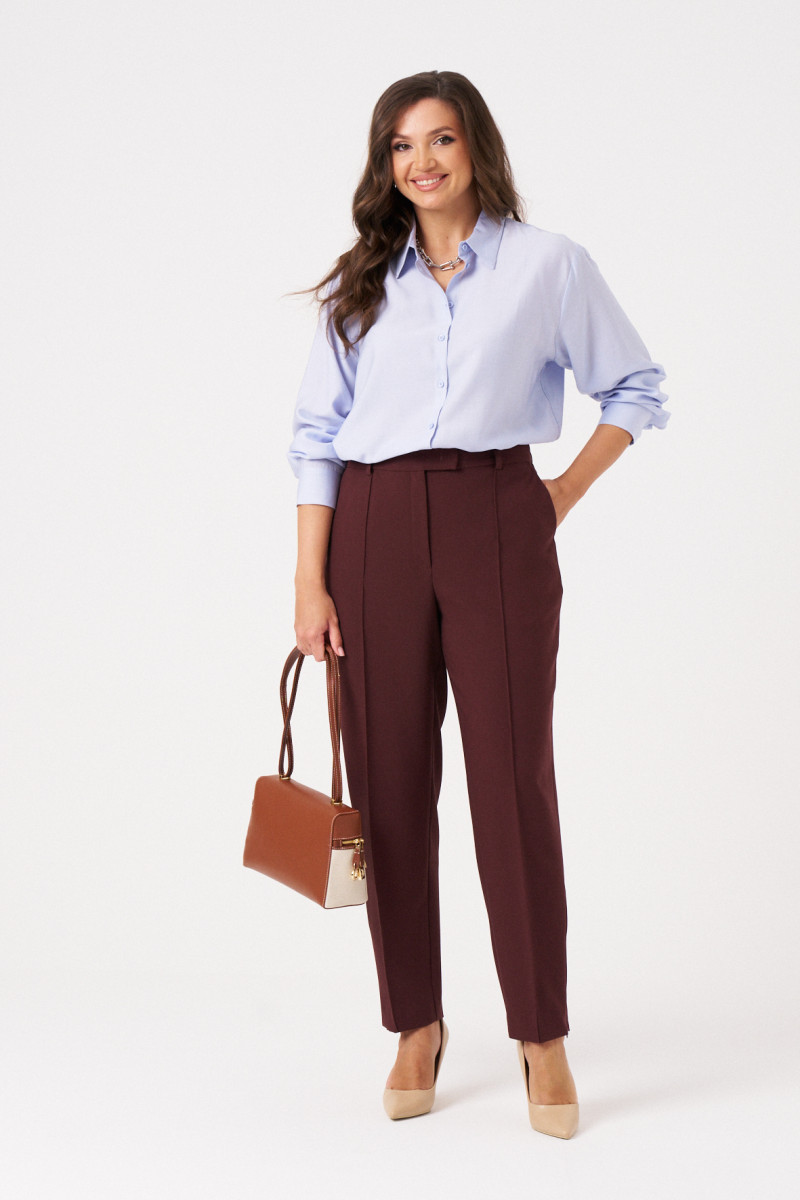 Женские брюки из поливискозной ткани классического коричневого цвета. Модель выполнена с притачным поясом, украшенным шлевками, что позволяет носить их как с ремнем, так и без него. Застежка расположена на крючок и молнию в среднем шве для удобства. Передняя часть украшена застроченной стрелкой, а сзади — двумя талиевыми вытачками и карманом с листочкой. В боковых швах расположены карманы с подкройным бочком, а в нижней части — вставленна молния для дополнительного комфорта при надевании. Эти брюки универсальны и подходят для различных случаев, сочетаясь как с деловой, так и повседневной одеждой.