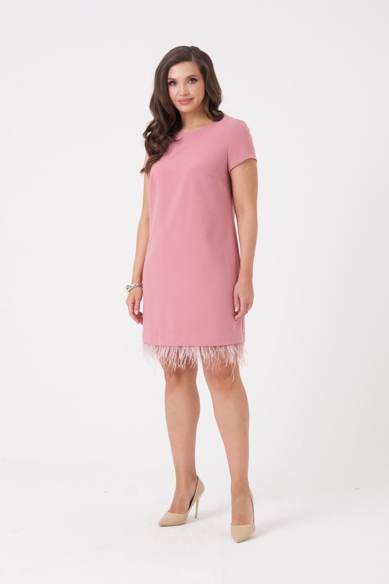 Это женское платье из поливискозной ткани, предназначенное для повседневной носки. Перед имеет две нагрудные вытачки, что придает изделию аккуратный и стройнящий силуэт. Спинка выполнена со средним швом и оснащена потайной застёжкой-молнией в шве для удобства надевания. Нижняя часть платья украшена декоративными перьями, добавляющими оригинальности и изящества образу. Перья крепятся на тесьму с кнопками, что позволяет отстёгивать их перед стиркой либо носить платье без них. Горловина, расширенная создает комфортное облегание и стильный вид. Короткие втачные рукава с фигурным низом делают платье практичным и легким в носке. Платье тёмно-розового цвета подхойдёт для различных случаев.
