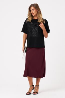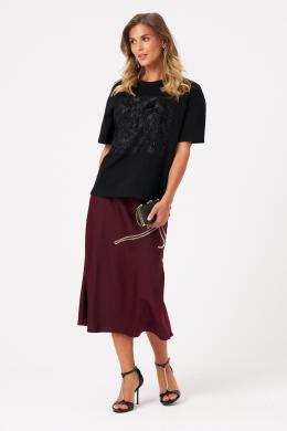 Горловина обработана притачной тесьмой, что гарантирует аккуратный и прочный финиш. Линия плеча спущена, создавая расслабленный и современный образ. Рукава втачные, расположены на уровне локтя, что добавляет стилю модную асимметрию и удобство в носке.
