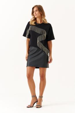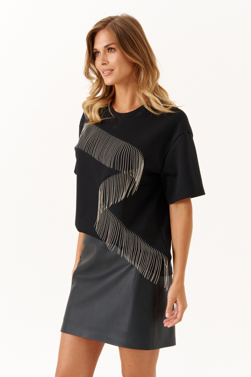 Это женский джемпер, выполненный из мягкого трикотажного полотна, идеально подходящего для повседневной носки. Модель отличается комфортной посадкой и стильным дизайном. Горловина чуть расширенная, что создает приятное ощущение свободы и легкости при ношении. Перед с фигурным швом, в который вставлена тесьма с цепью, которая переходит на рукав. Данный декор добавляет образу расслабленности и современного стиля. Линия плеча немного опущена. Рукава втачные длиной до уровня локтя. Этот джемпер чёрного цвета отлично подойдет для повседневных образов, сочетая уют и стиль.