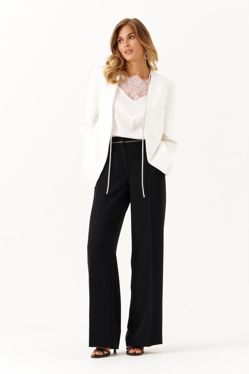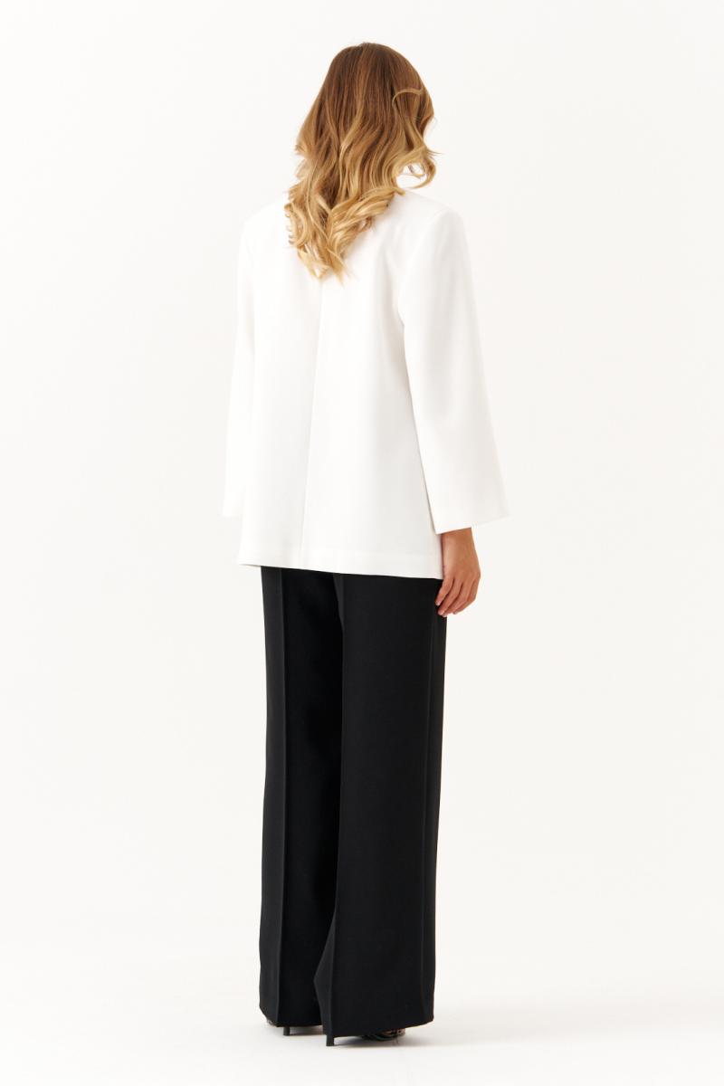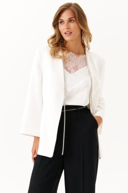 Жакет женский из легкой струящейся ткани, предназначенный для торжественных мероприятий. Модель выполнена в белом цвете и отличается элегантным кроем с двумя нагрудными вытачками на переде и средним швом на спинке, что обеспечивает идеальную посадку по фигуре. Край борта украшен декоративным шнуром со стразами, который плавно проходит вдоль V-образной горловины и борта, придавая изделию утонченность и изысканный блеск. Широкие втачные рукава добавляют свободу движения и стильный акцент. Этот жакет станет прекрасным дополнением к вечернему или праздничному образу.