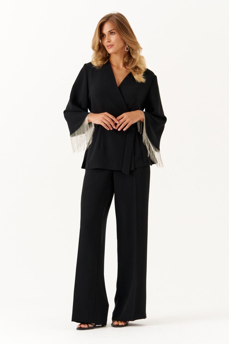 Жакет женский выполнен из лёгкой струящейся ткани, что обеспечивает комфорт и элегантность как для повседневной, так и для торжественной носки. Модель имеет запах, что подчёркивает женственность и делает силуэт более выразительным.