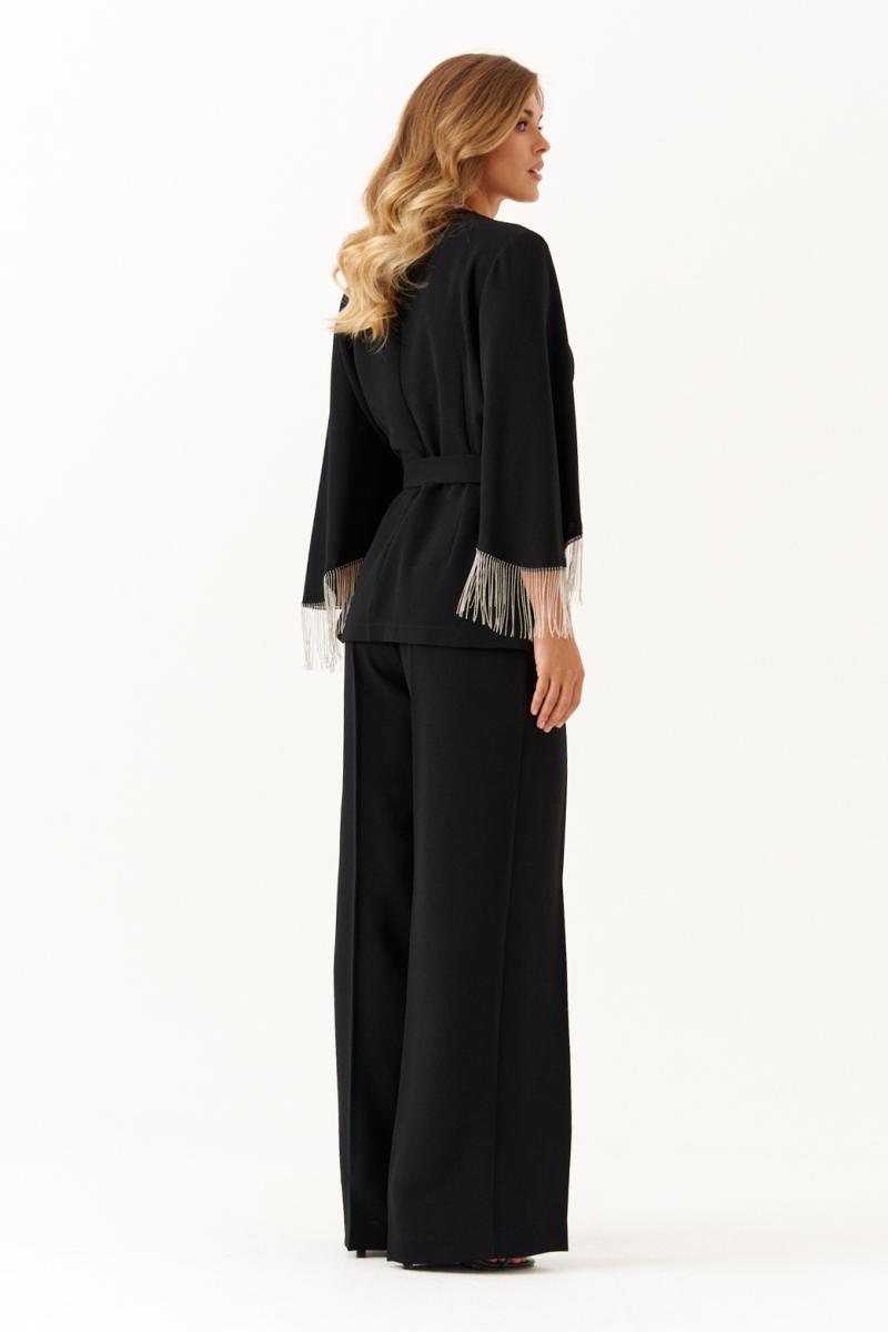Горловина выполнена в V-образной форме, придавая образу изящность и удлинённость. Рукава втачные, длинные. Низ рукавов оформлен декоративной отделочной тесьмой с цепочкой, которая служит стильным акцентом и завершением модели.