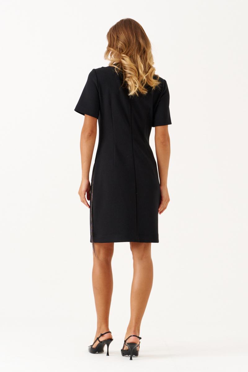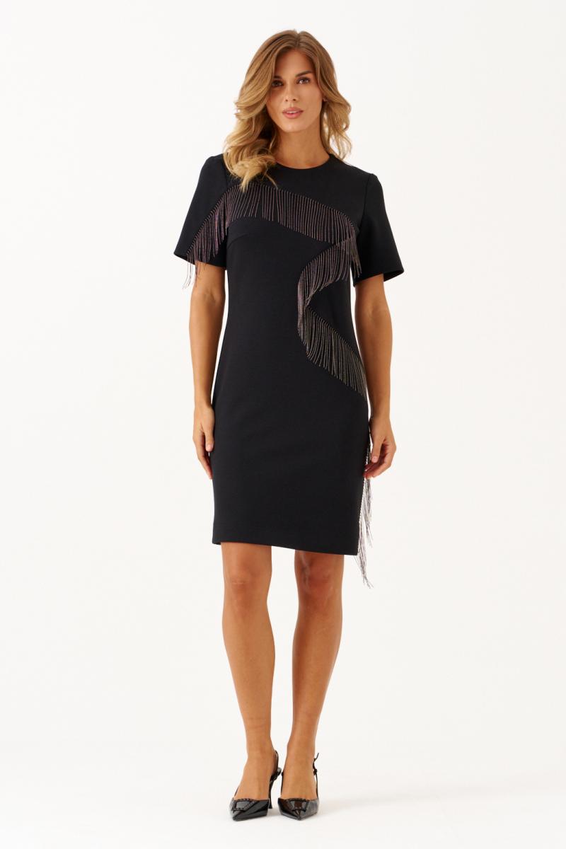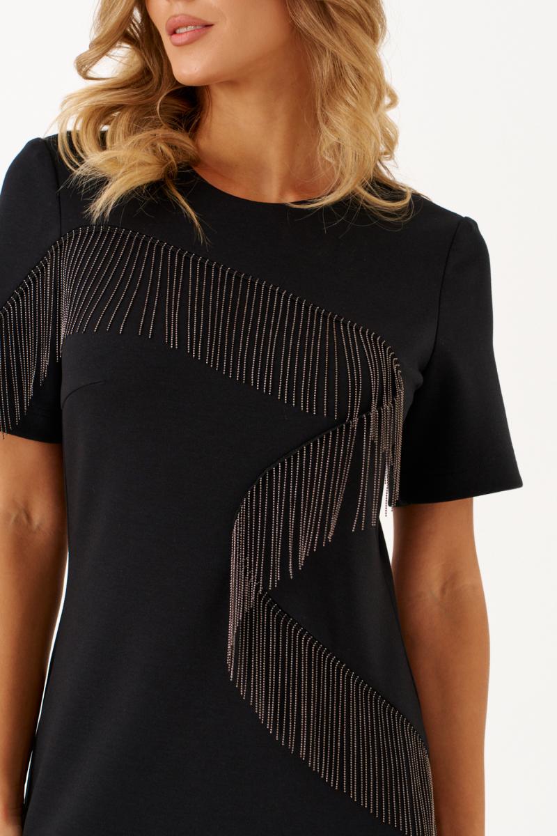Элегантное платье чёрного цвета из поливискозного трикотажа. Модель полуприлегающего силуэта идеально подходит как для повседневной носки, так и для торжественных случаев. Платье выполнено из мягкого и комфортного трикотажного полотна. Перед украшен двумя нагрудными вытачками и декоративной тесьмой с цепочкой фигурного направления, переходящей на рукав. Спинка со средним швом и потайной молнией обеспечивает удобную посадку. Расширенная горловина и рукава длиной чуть выше локтя создают стильный и изящный образ. Длина миди делает платье универсальным и актуальным для любого сезона.