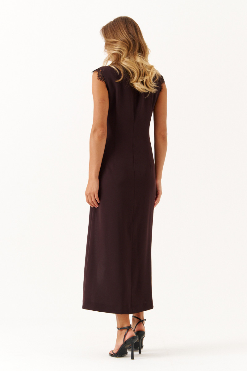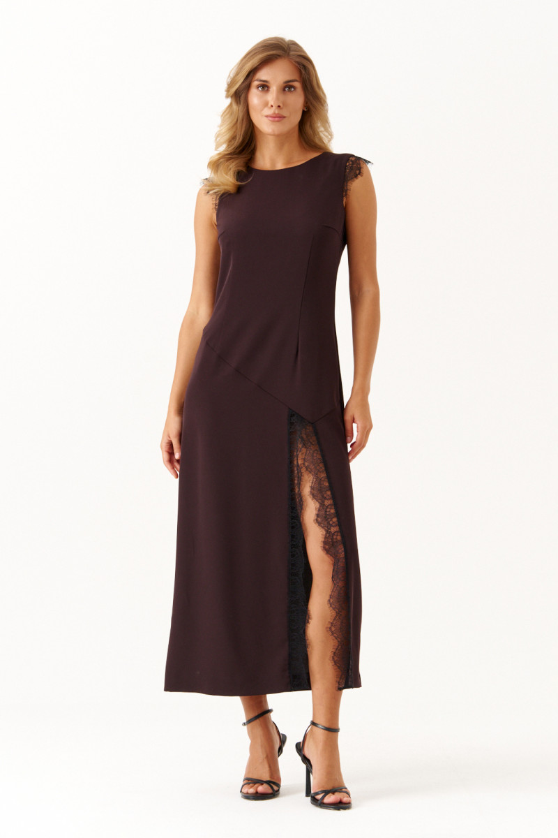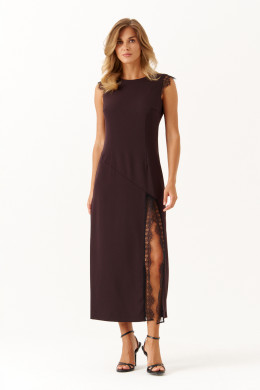 Женское платье из струящейся ткани — идеально для повседневного образа. Чёрное макси-платье, выполненное из мягкой и удобной струящейся ткани, отлично подойдет для ежедневной носки. Модель отличается криволинейной линией по переду и двумя нагрудными и талиевыми вытачками, что создает элегантный силуэт. Передняя нижняя часть платья украшена разрезом с кружевными вставками, добавляющими нежности и женственности. Спина с средним швом, застежкой-молнией и талиевыми вытачками обеспечивает хорошую посадку. Расширенная горловина и короткие рукава с декоративной кружевной отделкой делают образ еще более утонченным и женственным.